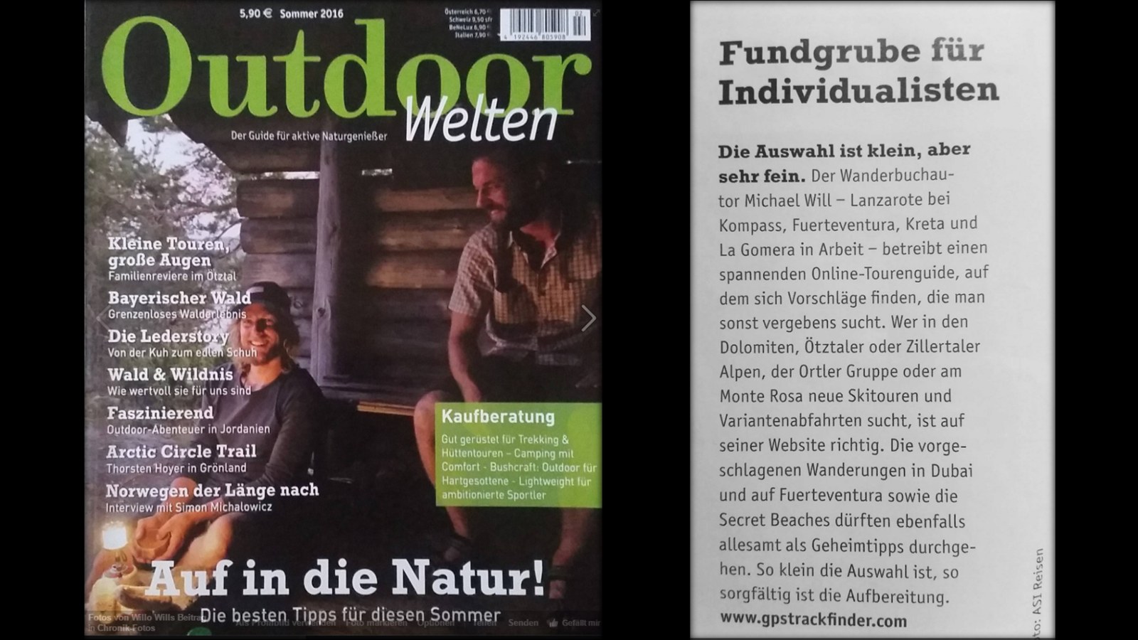 Das Magazin OutdoorWelten erscheint zweimal jährlich im Mai und im November. OutdoorWelten steht unter anderen für: Zitat Mediadaten: „ …stillt die Sehnsucht nach Natur, kleinen Fluchten sowie kleinen und großen Outdoorabenteuern...“. Dieses Zitat reflektiert perfekt meine mir gesteckte Zielvorgabe beim Schreiben der Wanderbücher und beim Betreiben meiner Webseite wieder. In diesem Zusammenhang freue ich mich umso mehr, dass in der diesjährigen Sommer 2016 Ausgabe – mit einer Auflage von 40.000 Magazinen - neben vielen spannenden Beiträgen, im Kapitel clevere Ideen und Tipps, in einem Artikel GPSTrackFinder erwähnt wurde.