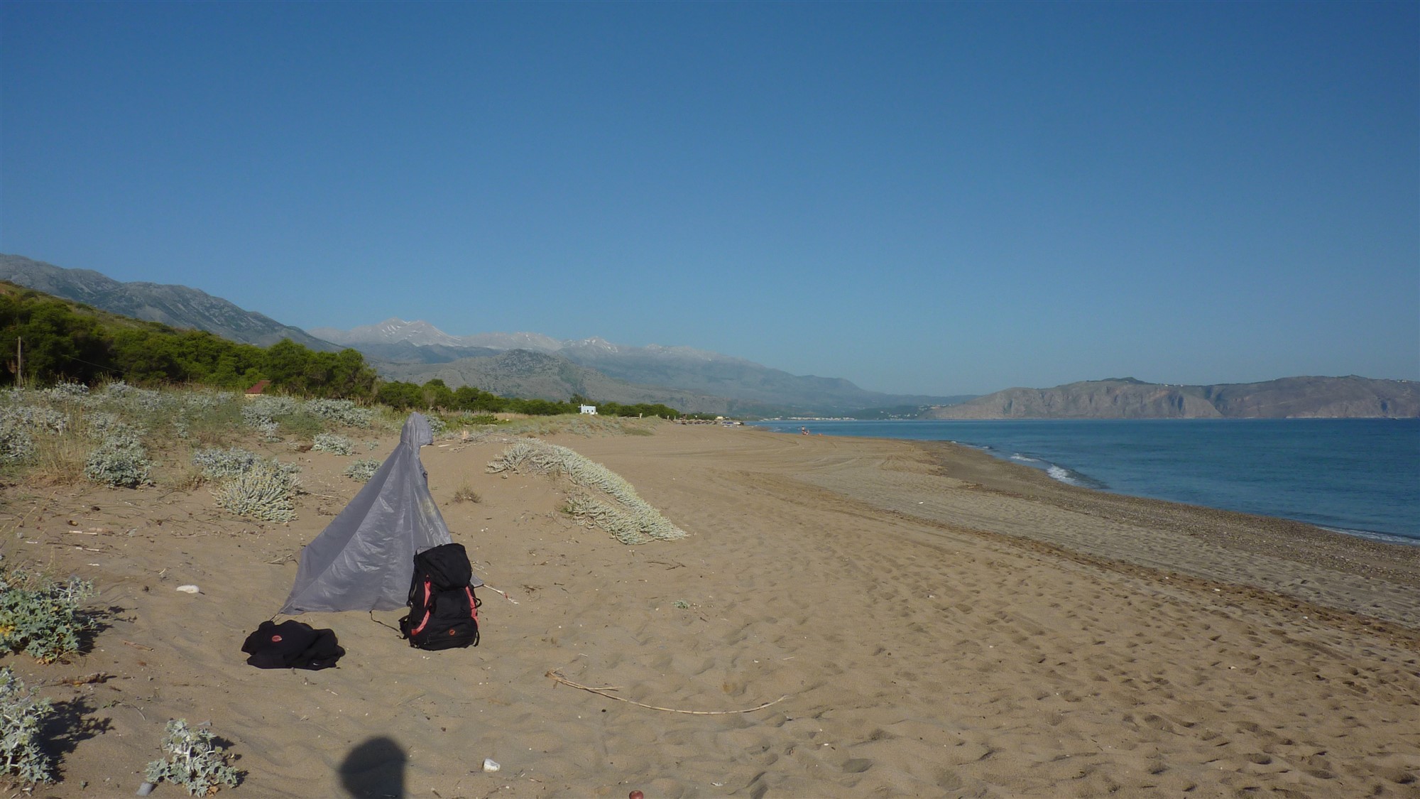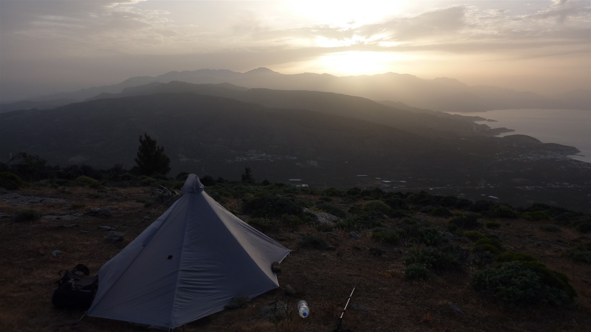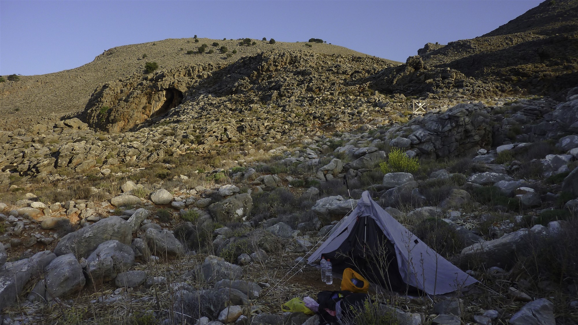 Da Kreta gut 250 km in seiner Länge misst und die Anfahrtswege auf Straßen und Schotterpisten kurvenreich sind, empfiehlt es sich für Tageswanderungen, immer nahe der gewählten Wanderung eine passende Unterkunft zu suchen. So reduziert man die Fahrzeit auf ein Minimum. Begibt man sich auf den E4 Fernwanderweg, so ist dies natürlich nicht möglich. Auch gibt es nicht an allen Etappenzielen Übernachtungsmöglichkeiten. So muss man unweigerlich biwakieren. Im Übernachtungsverzeichnis des Wanderführers sind diese Etappen hervorgehoben. Offiziell ist aber wildes Campen auf Kreta nicht erlaubt. Trotzdem sieht man an abgelegenen Flecken immer wieder wilde Camper. Die wenigen offiziellen Campingplätze liegen natürlich nicht am Fernwanderweg. Sollte man sich selbstverantwortlich zum wilden biwakieren entscheiden, so sind folgende Grundregeln wichtig. Verlasse Deinen Übernachtungsplatz, so wie Du ihn vorgefunden hast. Definitiv keinen Müll hinterlassen. Steine zur Befestigung des Zeltes wieder an ihre alte Stelle zurücklegen. Die Stelle so zurücklassen, dasss keine Übernachtungsspuren zu erkennen sind. Der Camper ist zu Gast in der Natur, so vermeide Lärm. Offenes Feuer auf Kreta ist aufgrund der extrem hohen Waldbrandgefahr strengstens verboten. Die einfachste Variante für die Notdurft ist, den Hintern ohne Klopapier zu säubern, die Kombination aus Wasser und Waschlappen oder Stofflappen. Die Verwendung von Tempotaschentüchern geht überhaupt nicht! Diese lösen sich in der Natur so gut wie gar nicht auf! Recycling-Toilettenpapier ist eine Wahl. Mein Tipp: Beim Projekt „Goldeimer“ gibt es ein dreilagiges und 100 % Recycling-Toilettenpapier mit dem Label: „Blauer Engel“. Poste nicht Deinen Campingstandort auf den sozialen Medien, genieße einfach den Moment. Vor der Abreise sollte noch einmal im Internet geprüft werden, ob sich etwas an dieser lockeren Handhabung des Verbots etwas geändert hat. Befolgt man die Hinweise, so kann man mit reinen Gewissen mit dem Zelt losziehen. Nachfolgend ein paar Impressionen ohne Ortsangabe.