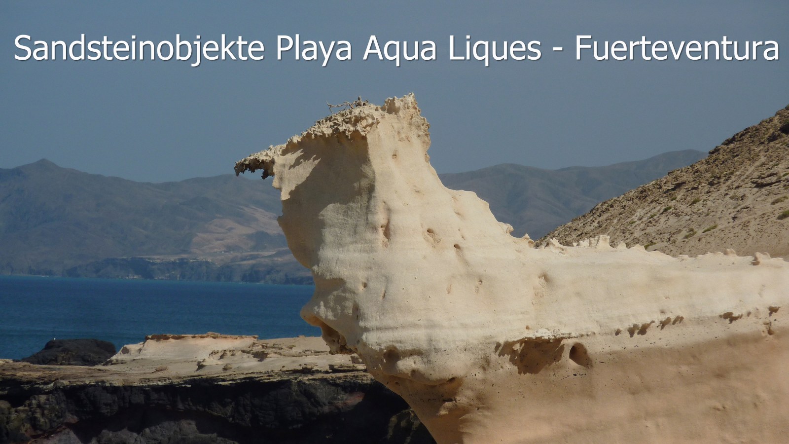 Wir starten die Wanderung in westlicher Richtung und gehen im 90°-Winkel zur Asphaltstraße, die auf den Hügel führt. Zuerst übersteigen wir weglos den vor uns liegenden Sandhügel. Schon bald können wir in der Ferne die Nordwestküste erblicken, die nach ca. 2,5 km Fußmarsch erreicht wird. Auf der Wanderung queren wir zahlreiche Pfade, die wir alle ignorieren. Da keine weiteren markanten Wegpunkte vorhanden sind, ist die Navigation nicht einfach. Wir steigen auf das untere Plateau direkt oberhalb des Meeresspiegels ab und gehen von dort aus links an der Küste entlang. Wir treffen auf eine wilde Küstenlandschaft mit vom Wind geformten Sandsteinobjekten. Mitunter kann hier auch kreativ gesammelter Müll betrachtet werden. Nach einiger Zeit kommen wir an die kleine, einsame Bucht, den Playa Agua Liques. Je nach Wellengang und Stand der Gezeiten präsentiert sich ein sehr schöner Strandabschnitt, der zum Verweilen einlädt. Für den Rückweg nehmen wir gleich die erste Aufstiegsmöglichkeit. Wir orientieren mithilfe des GPS-Tracks so wie eine Art alten Bunker oder an einer kleinen Düne mit einem alten Bunker als Wegpunkt. Sobald wir auf dem Scheitelpunkt der Düne ankommen, können wir bereits links unterhalb die Asphaltstraße und unser geparktes Auto sehen.