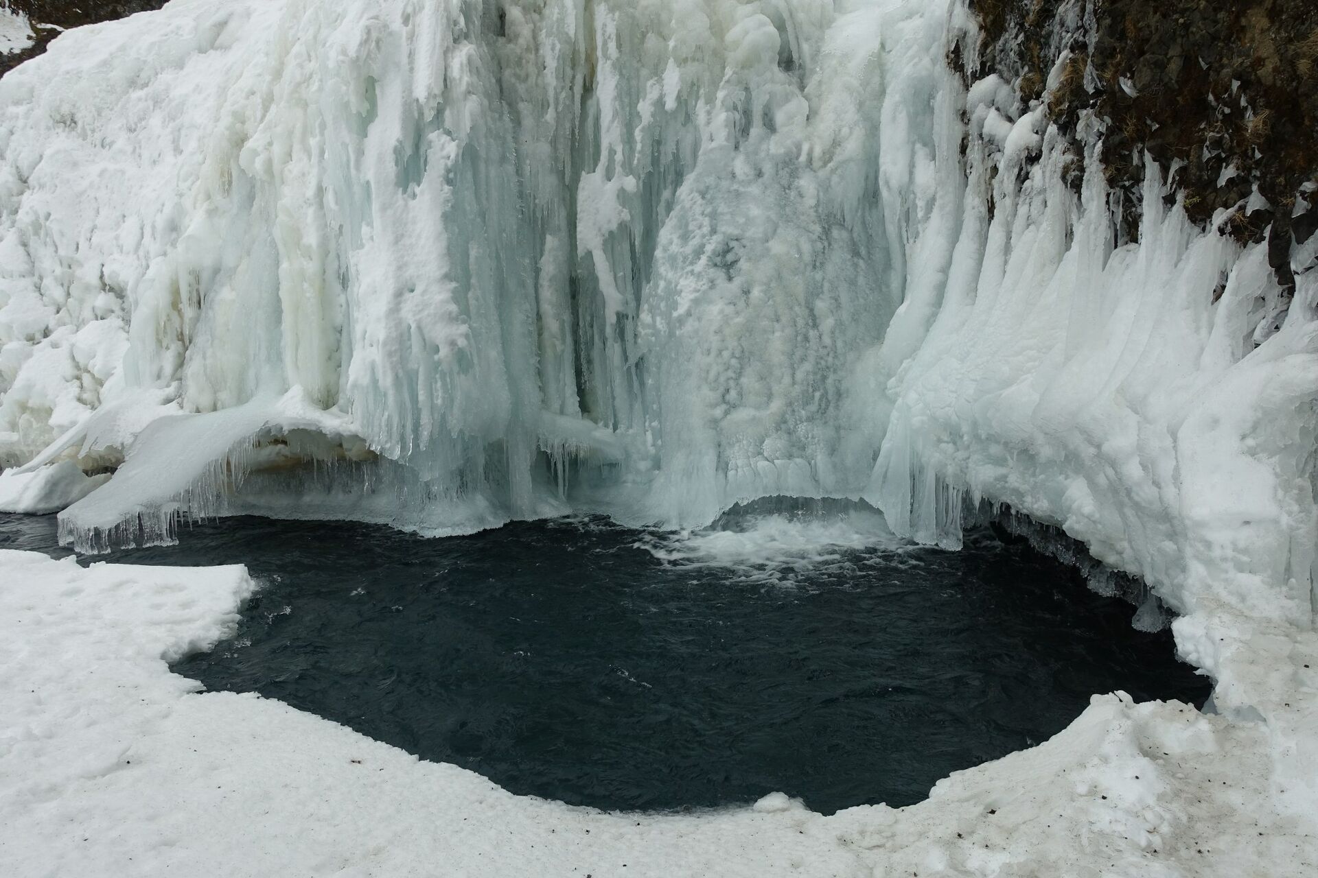 Island – Der eingefrorene Stjórnarfoss hat eine Höhe von ca. 15 m.