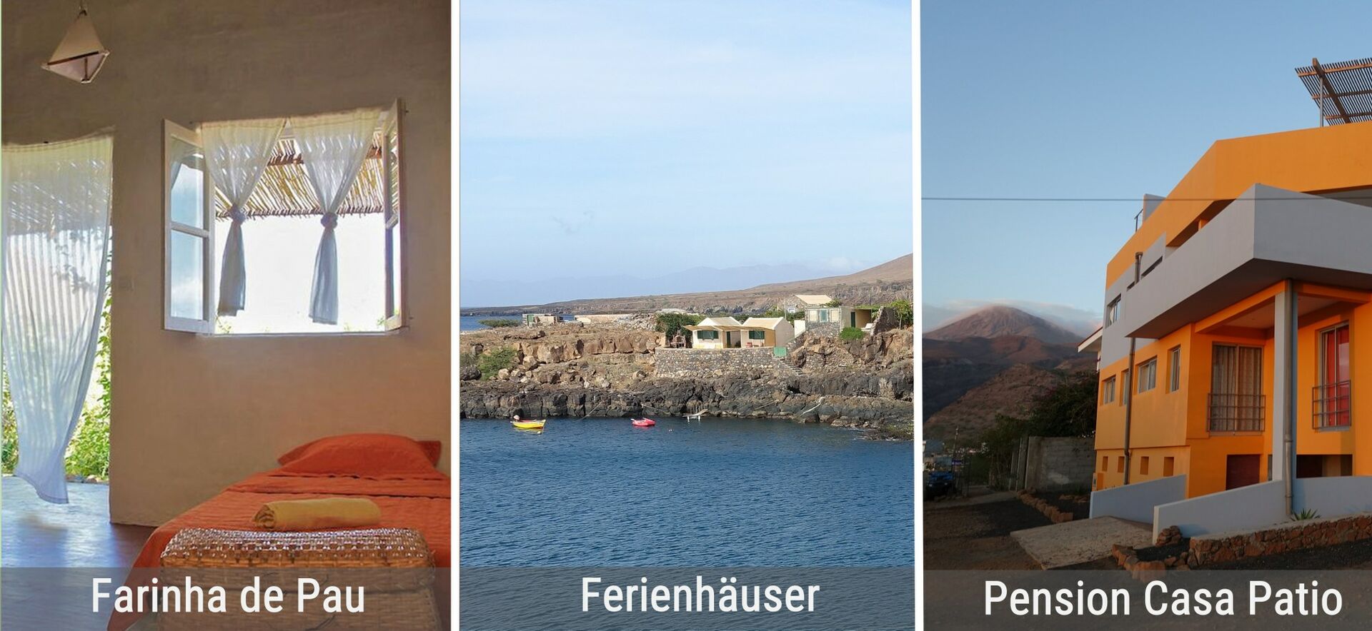16.554174 -24.083519 | Auf der Kapverdischen Insel São Nicolau kann man am Rande des Fischerdorfs Carriçal, im äußersten Nordosten der Insel, zwei Ferienhäuser in traumhafter Lage mieten, direkt am Meer und in völliger Ruhe, an einem der schönsten Flecken der Kapverden. Hier kann der Urlauber: Sonne tanken – entspannen – wandern – schwimmen – tauchen – angeln – kochen – kreativ arbeiten – überwintern – und vieles mehr – der ideale Ort zur Erholung! Da, wo die Kapverden tatsächlich noch Kapverden sind! | €€€ | E-Mail | zu buchen bei: Webseite | siehe Tour 55 |