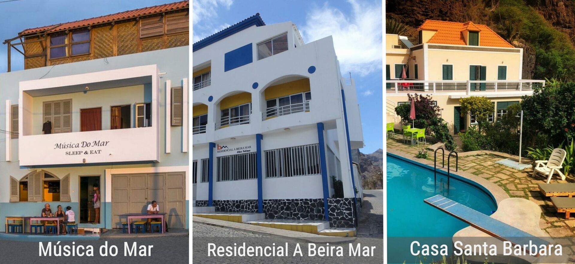 17.202917 -25.093433 | Der Kapverdische Familienbetrieb Residencial A Beira Mar liegt direkt am Hafen. Die zehn einfachen Zimmer verfügen über Bad, Terrasse und mindestes seitlichen Meer- und Hafenblick. | € | Rª Grande / Ponta do Sol | residencial.abeiramar@gmail.com | Tel.: +2382251008 | zu buchen unter http://www.ruraltours.cv | siehe Tour 20 |