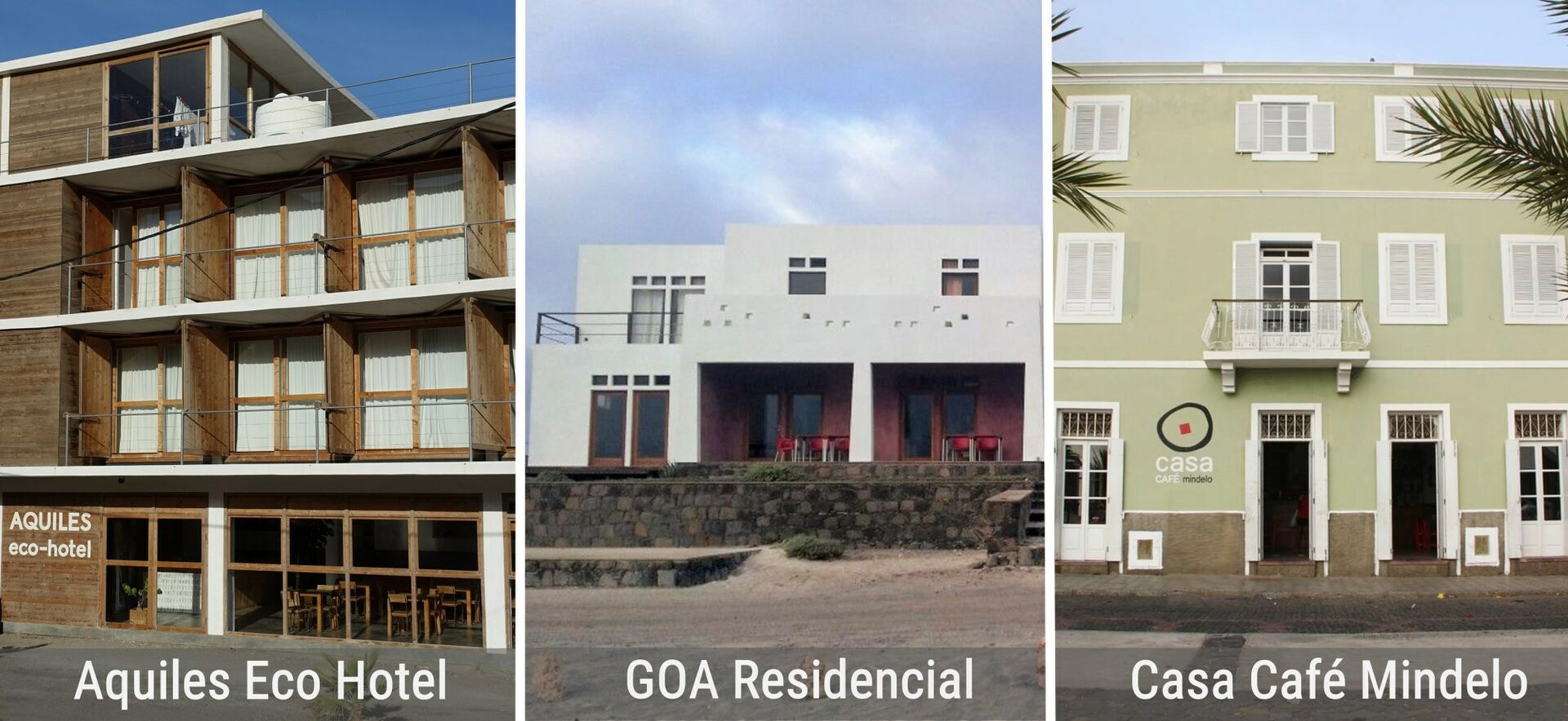 16.823766 -25.060560 | Das Aquiles Eco Hotel, am Strand des Fischerortes São Pedro, ist ein Prototyp für nachhaltiges Bauen auf den Kapverdischen Inseln. Es besteht aus 13 Holzcontainern, die in einem Betonskelett platziert sind. Wesentliches Baumaterial ist zertifiziertes Holz. Die auf der Insel vorhandenen Rohstoffe Sand und Stein wurden nicht genutzt, da sie gesetzlich geschützt und – anders als Holz – nicht kurzfristig erneuerbar sind. Auch die Möbel sind aus recyceltem Holz gebaut. Das Hotel hat 13 containergroße Zimmer: je sechs im ersten und zweiten Stock sowie eine Suite mit Meerblick im dritten Stock. Die boxartigen Zimmer, mit weißgekalkten Holzpaneelen, sind schlicht und spartanisch eingerichtet. Überall im Hotel finden sich Kunstwerke des Künstlers und Architekten Moreno Castellano. Die Unterkunft liegt 30 m vom Strand und 7 km von Mindelo entfernt. WLAN nutzen Sie kostenfrei. Die Zimmer verfügen jeweils über einen Balkon. Das eigene Bad ist mit einer Dusche und kostenfreien Pflegeprodukten ausgestattet. Ihr Zimmer begrüßt Sie mit Stadtblick. Ein Biofrühstück aus regionalen Zutaten wird jeden Morgen im Aquiles Eco Hotel serviert. Zu den weiteren Annehmlichkeiten zählen die Gemeinschaftslounge und die Gepäckaufbewahrung. | €€ | Sao Pedro, 1234 São Pedro–São Vicente | Webseite | reservas@aquilesecohotel.com | Tel.: +238328002 | zu buchen unter | Link zu Bookings.com | siehe Touren 34–43 |