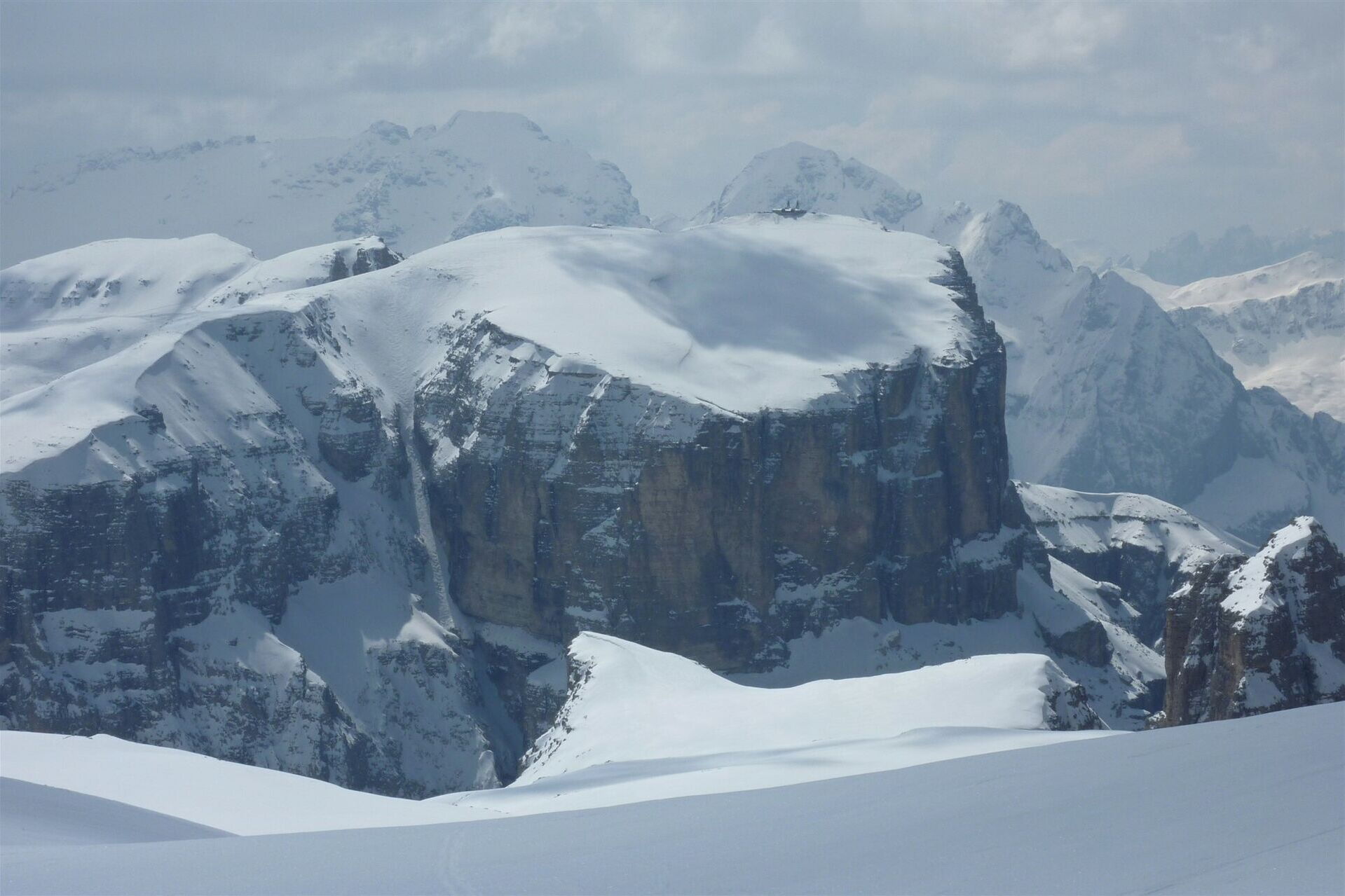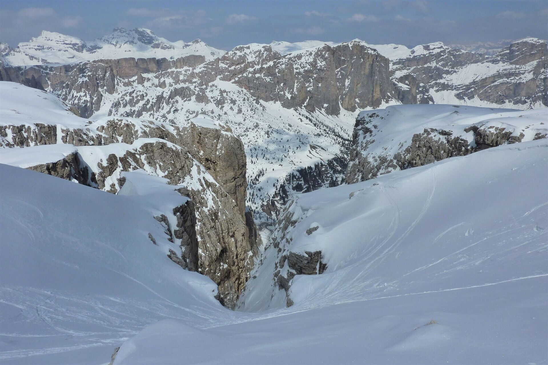 Variantenabfahrten - die Cirspitzen mit dem dahinterliegenden Sellastock
