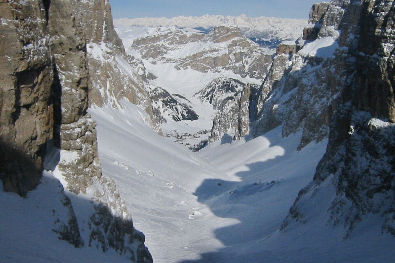 Variantenabfahrten - Blick vom Piz Miara zum Sass Pordoi mit der Heini Holzerscharte