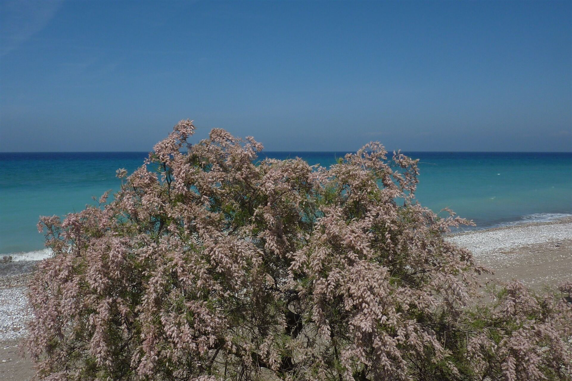 Rhodos - blühende Tamarrisken am Strand
