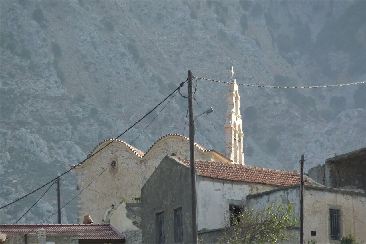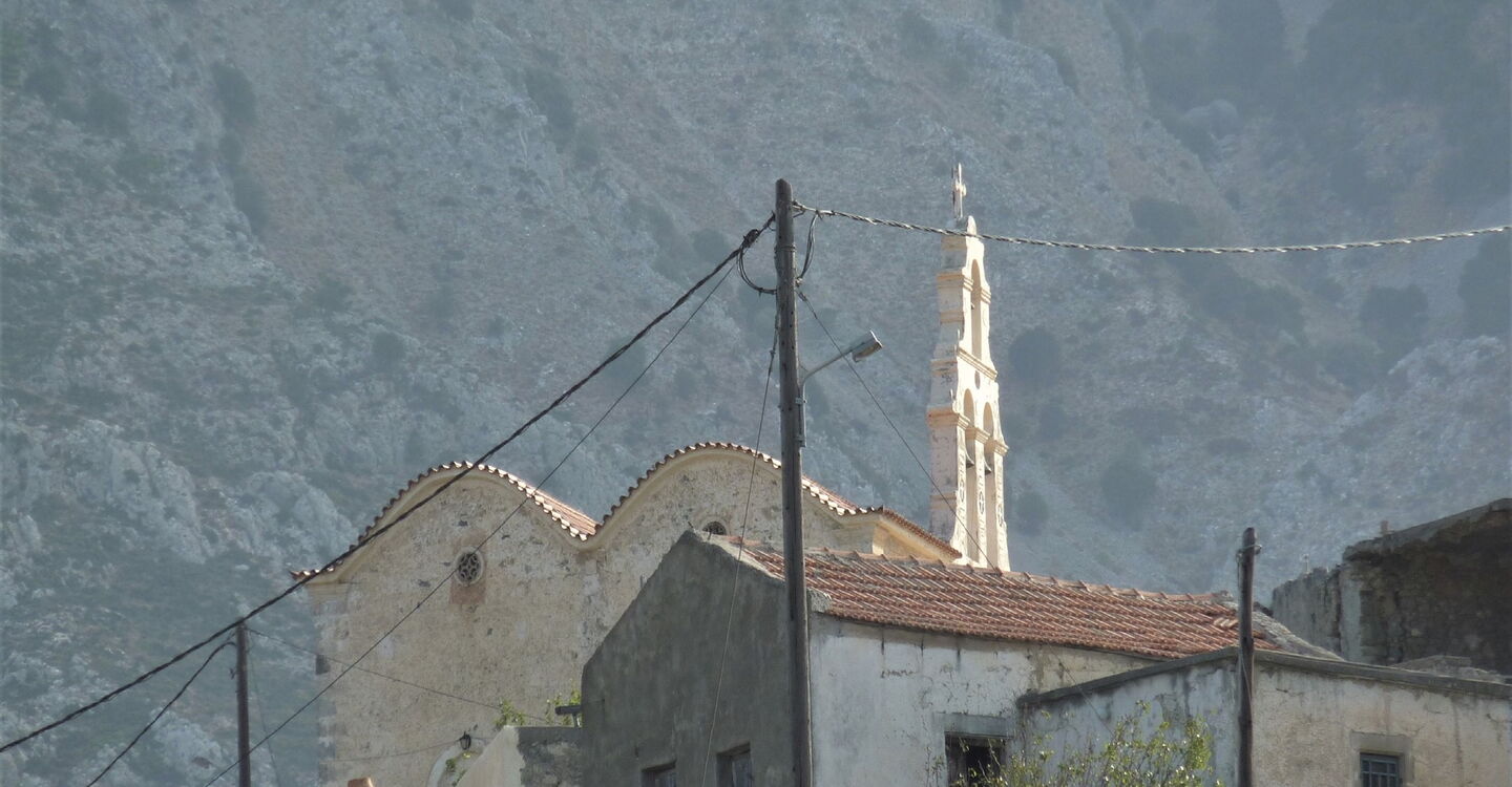 Wir befinden uns wieder auf kultiviertem Land, zahlreiche uralte Olivenbäume säumen den Weg. In der Ferne lässt sich bereits das Dorf 04 Fourfourás (483 m) ausmachen. Wir ignorieren die zahlreichen Wirtschaftswege nach rechts und links bis zur Hauptstraße.