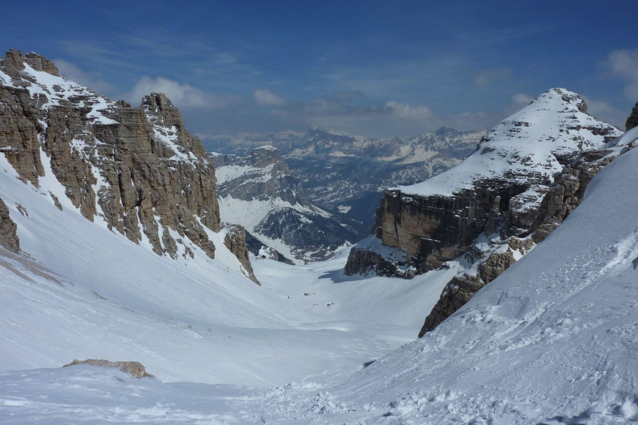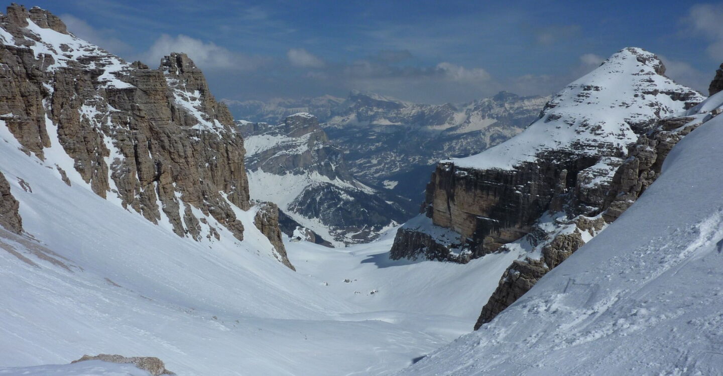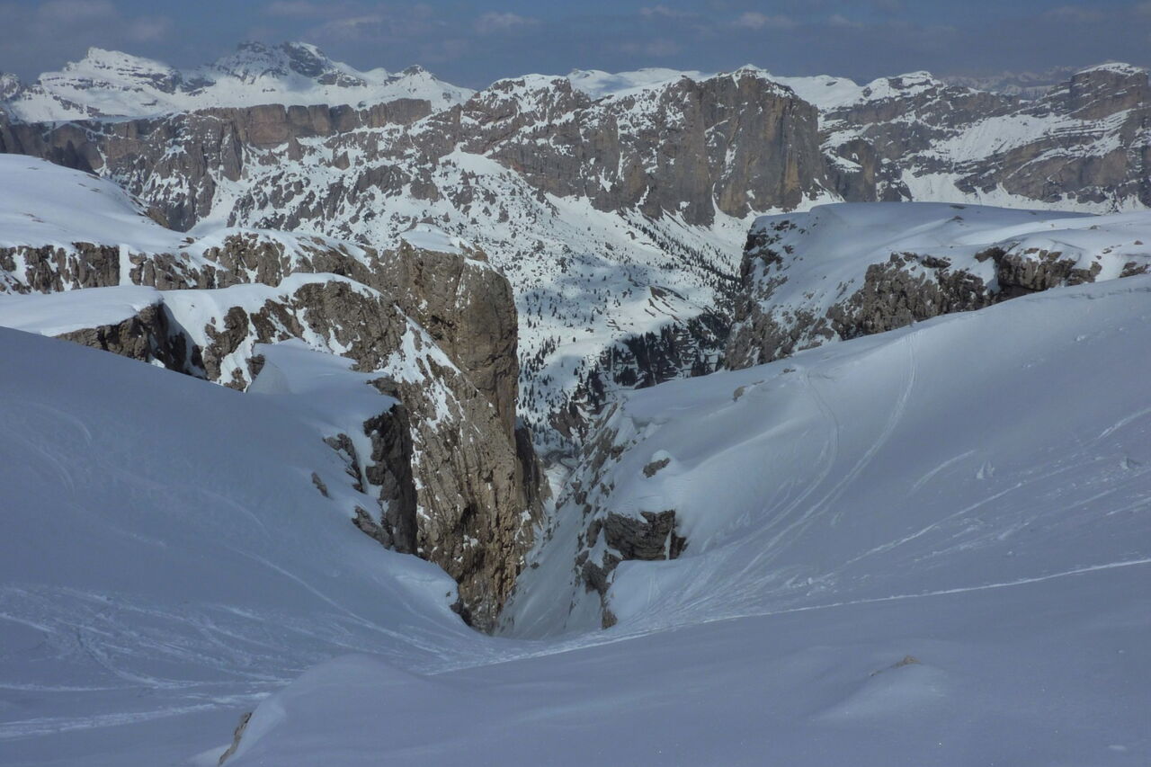 Wenn noch keine Spur vorhanden ist, ist die Orientierung nicht einfach, aber mithilfe des GPS-Tracks gut machbar. Die Abfahrt führt über einen Nordhang. Folgende Ausrüstung wird empfohlen: Produkte für alpine Sicherheit im Schnee, Tourenski und Skitourenhelm. Es empfiehlt sich die Einkehr in das Rifugio Maria bei der Bergstation, welches nach Maria Piaz, der Pionierin des Tourismus am Pordoipass, benannt wurde. Beste Jahreszeit: Januar bis April. Uns erwarten kurze Stücke mit bis zu 50° Hangneigung.