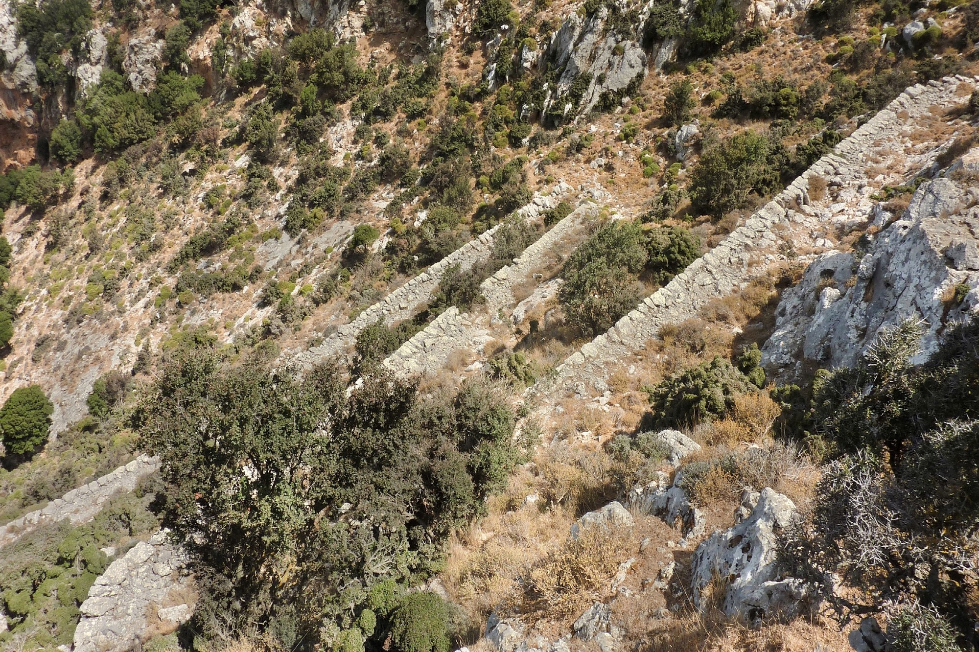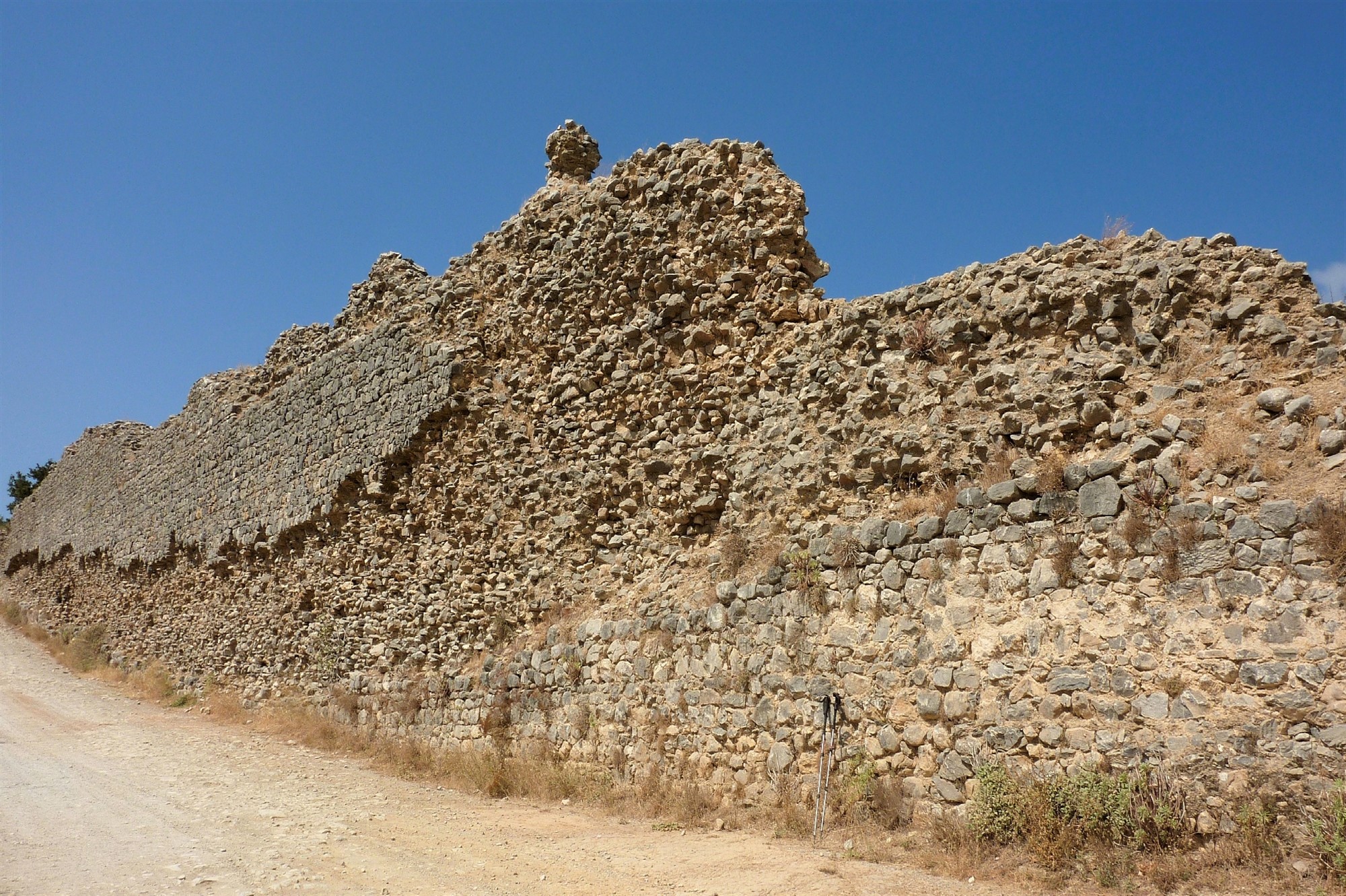 Dort gehen wir links, direkt hinter der Leitplanke sofort wieder links und erreichen die 05 Antike Stadt Lyttos (616 m). Sie gehörte zu den ältesten und mächtigsten Städten auf Kreta – ein Erzfeind von Knossos. Geht man noch an der Kirche vorbei, dann rechts an den Weinreben ein kurzes Stück den Abhang hinunter, so findet man die Überreste. Wir gehen auf dem weiterführenden Weg an der Kirche Agios Georgios vorbei, über den Bergrücken und weiter in Richtung einzeln stehender Türme. Aber bevor wir diese erreichen, biegen wir halb links auf die Schotterpiste ab. Auf dem betonierten Stück gehen wir rechts und sofort wieder links, sodass wir die Hauptstraße in Littos erreichen. Wir folgen dieser in einem großen Halbkreis um das Dorf herum. In einer Rechtskehre mit einem Verkehrsspiegel verlassen wir die Hauptstraße nach links bergauf. Wir tangieren kurz die Hauptstraße und gehen nun direkt nach Kastelli hinunter und bis zum Dorfplatz vor, wo wir 100 m rechts gehen und der Ausschilderung zum Hotel folgen.