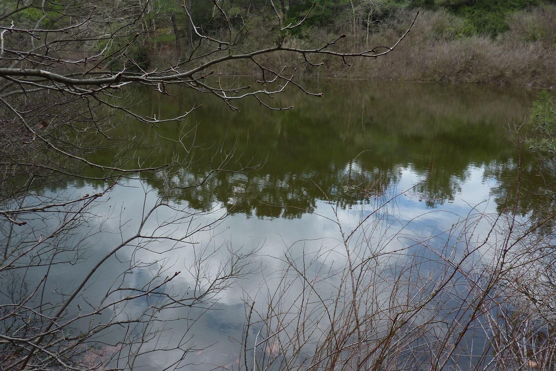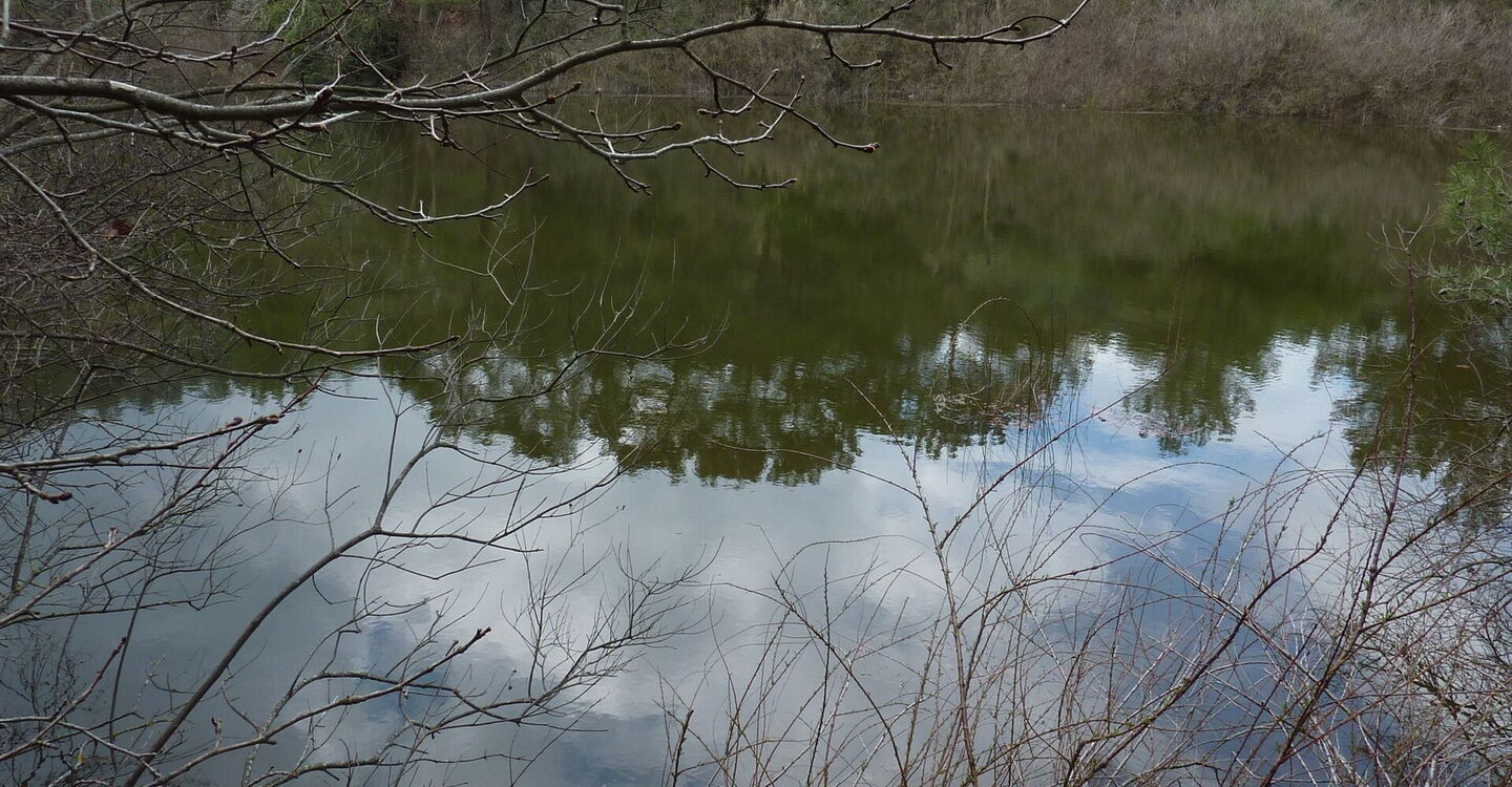 Am Ende des Sees queren wir den Bachlauf und gehen sofort links bergauf. In der folgenden scharfen Rechtskehre kann man eine Variante gehen, indem man dem Pfad links herunter, nach 20 m rechts, bis an den See folgt. Der Pfad schlängelt sich dann noch ein gutes Stück am See entlang, bis er nur noch schwer auszumachen ist und zur Schotterpiste aufsteigt. Oder man geht nicht zum See herunter und folgt einfach der Piste. Angekommen an der (05) Weggabelung (239 m), folgen wir dem Hinweg zurück zum Ausgangspunkt.