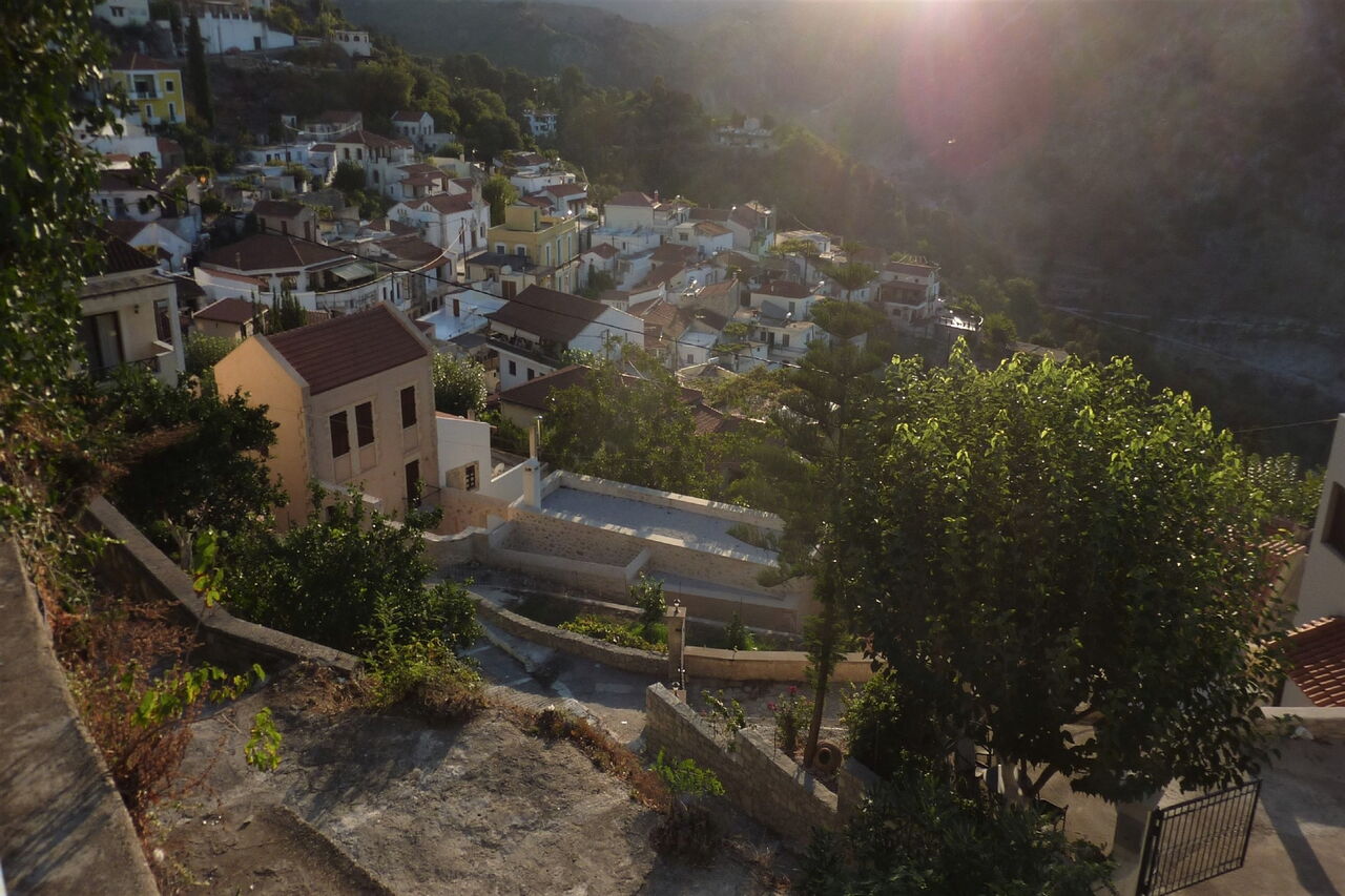 Nach 670 m zweigt links eine Piste zu dem geisterhaften Ruinendorf 04 Nisi (275 m) ab. Ein lohnender Abstecher in die Vergangenheit. Wir gehen wieder zum Hauptweg zurück und folgen der ursprünglich eingeschlagenen Richtung in eine weitere Schlucht, die wir in einer langen Rechtskehre durchqueren, bis wir an einer Asphaltstraße ankommen. An dieser gehen wir links, bis sie nach 350 m endet und wir fortan rechts der Asphaltstraße Richtung Argiroupoli folgen.