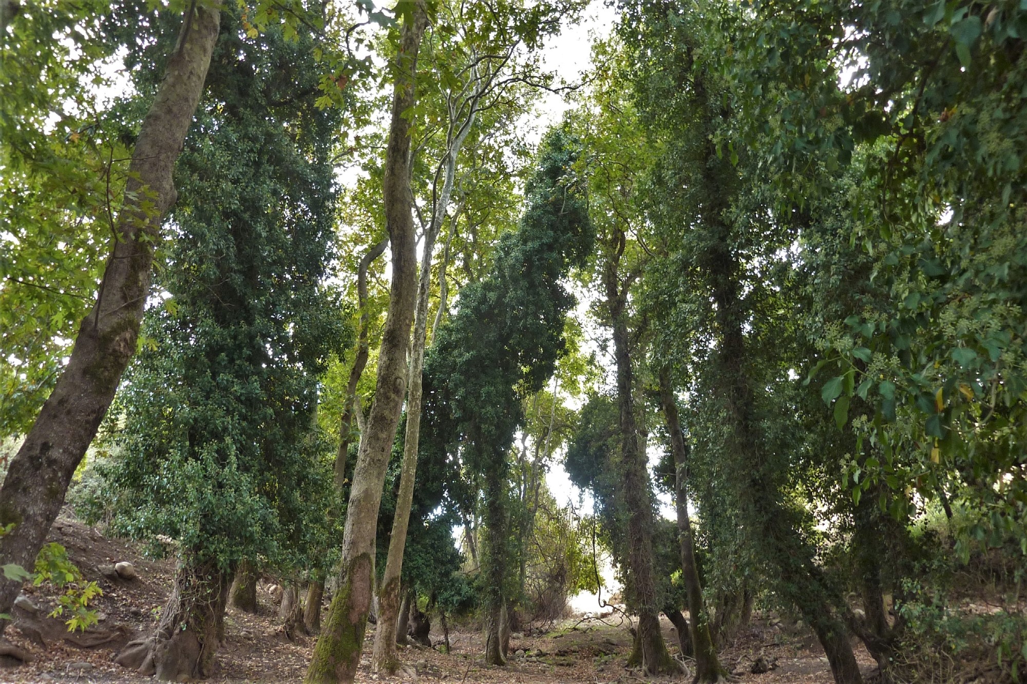 Wir folgen dem Wegweiser Richtung Ano Malaki, kommen im weiteren Verlauf an einer mit Steinen gepflasterten 02 Quelle (519 m) vorbei und überqueren eine Bergkuppe. Wir sehen rote Pfeile, die nach links weisen. Der Ausschilderung folgen wir auf der Schotterpiste Richtung Saitouris. Nur kurz später umlaufen wir ein schattiges Waldstück. Nach einer scharfen Rechtskurve endet unsere Piste und wir gehen links durch eine kleine Senke, rechts führt ein Bachbett in die Schlucht. Auf der Anhöhe ignorieren wir den linken Abzweiger. Wir treffen auf zwei aufeinanderfolgende Weggabelungen, an denen wir jeweils links gehen, um dann nach einem kurzen Anstieg, ca. 150 m, rechts weiterzuwandern. Bei der darauffolgenden Dreiwegegabelung gehen wir geradeaus weiter. Unsere Piste endet und wir gehen rechts, bis die Piste sich gabelt und wir halb links durch das Dickicht gehen. Diese Piste endet und auf einer weiteren Piste gehen wir rechts durch die Schlucht.