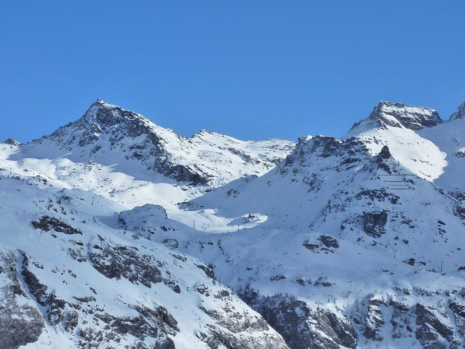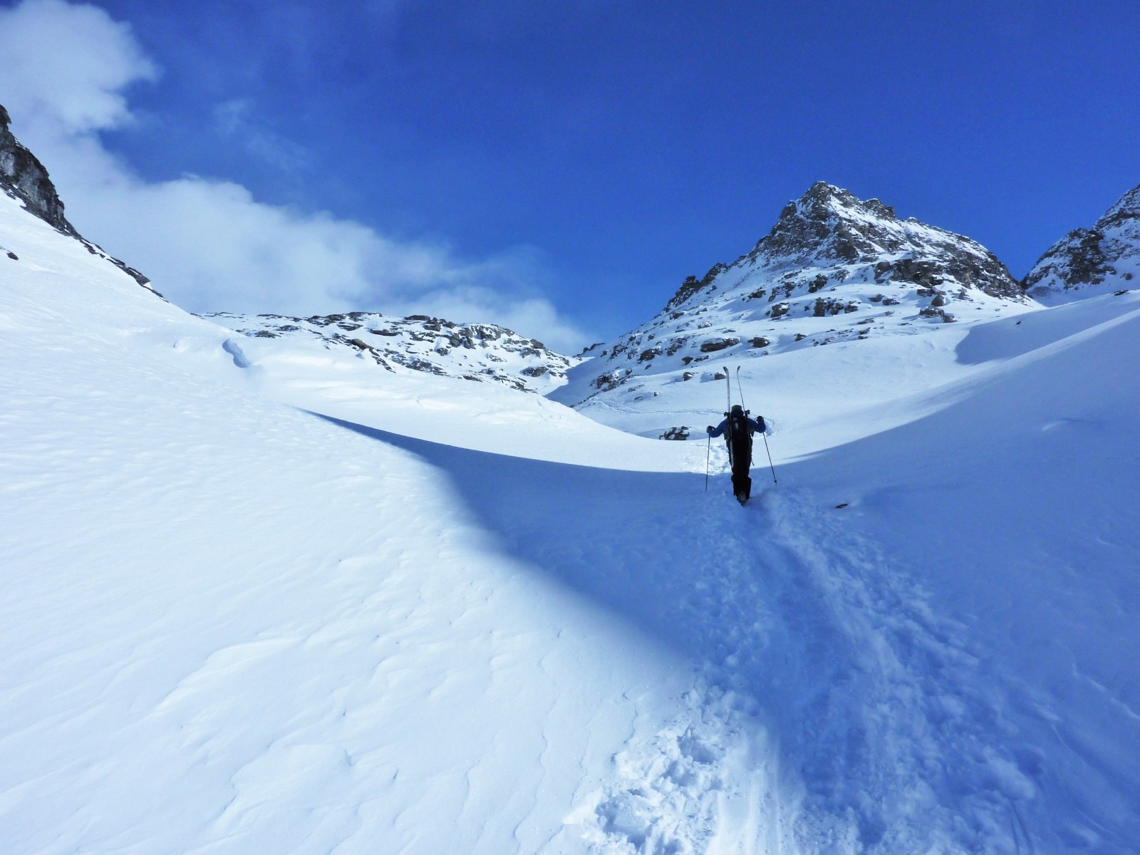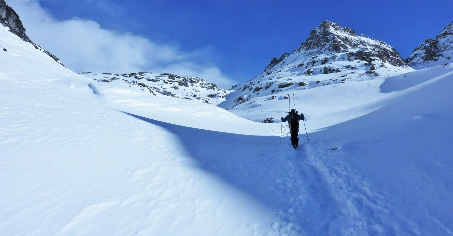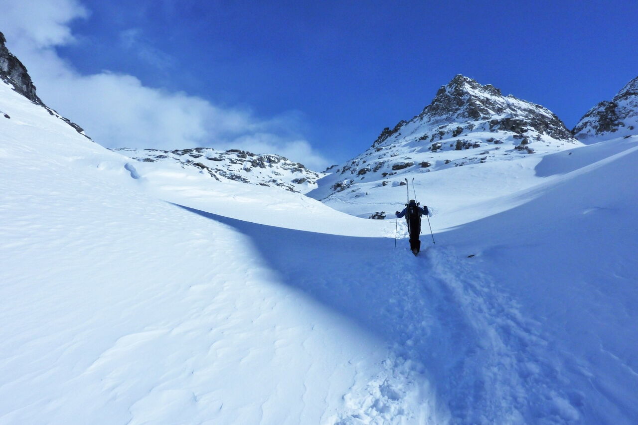 Wir fahren direkt auf den Monte Schwoarzehore zu und sehen links, wie sich ein Hochtal öffnet. Abwärts gehen wir mit Fellen direkt zum Passo Zube.