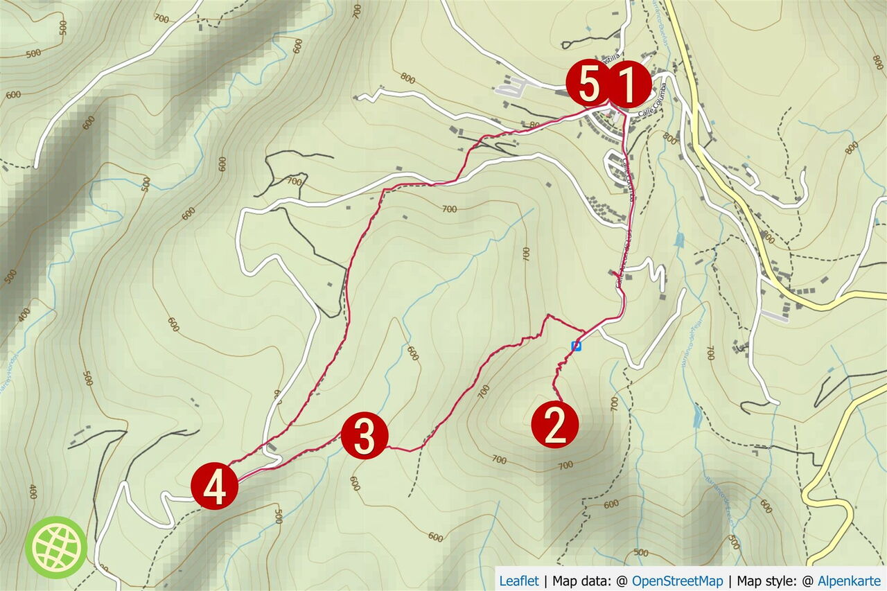 Vom (01) Start und Ziel in Alajero (813 m) bei der Gemeindeverwaltung gehen wir auf der Asphaltstraße bergab, vorbei an der Bushaltestelle und der rechts von uns liegenden Kirche, um dann links dem Verlauf der Straße zu folgen.