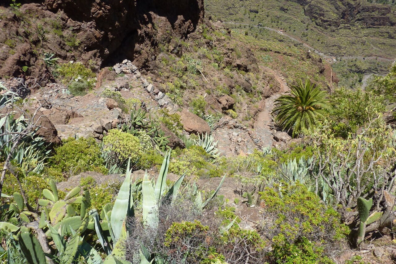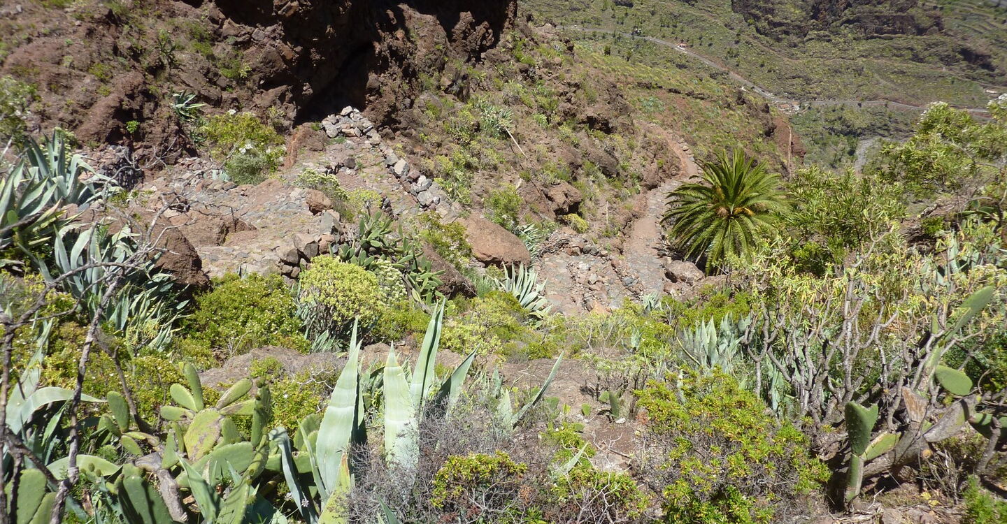 Direkt hinter der Kirche verlässt ein Camino nach rechts die Ortschaft. Wir folgen diesem Weg, bis sich das Tal stark verengt und wir oberhalb des (03) Barranco de Guarimiar (585 m) wandern. Mit gigantischen Tiefblicken führt der Weg in steilen Kehren und über ein mit Geländer gesichertes Erosionsband talwärts. Angesichts dieser Schönheit bleibt nur zu sagen: Dort innehalten, wo die Natur verzaubert.