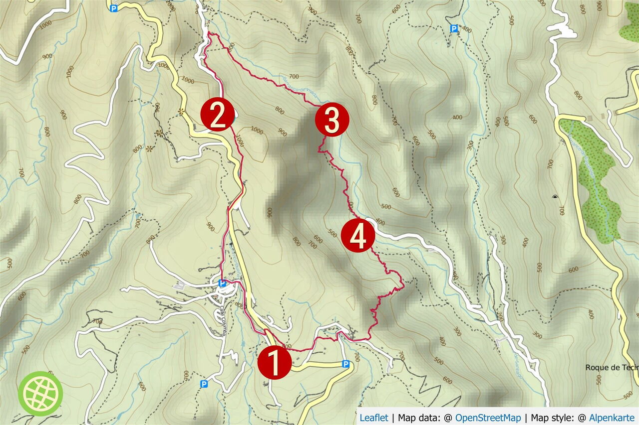Unermüdlich schraubt sich dieses architektonische Kunstwerk von Camino über 340 Höhenmeter bis in die Ortschaft (05) Targa (735 m) hinauf. Wir laufen auf der Asphaltstraße rechts durch den Ort, um nach einer ersten Linkskehre - bei dem Haus mit dem grünen Garagentor - den Camino rechts bergauf zu begehen. Abermals erreichen wir eine Straße, die wir 90 Meter nach links begehen, um auf die große Steinplatte vom Hinweg zu treffen. Der verbleibende Rückweg ist der Hinweg.