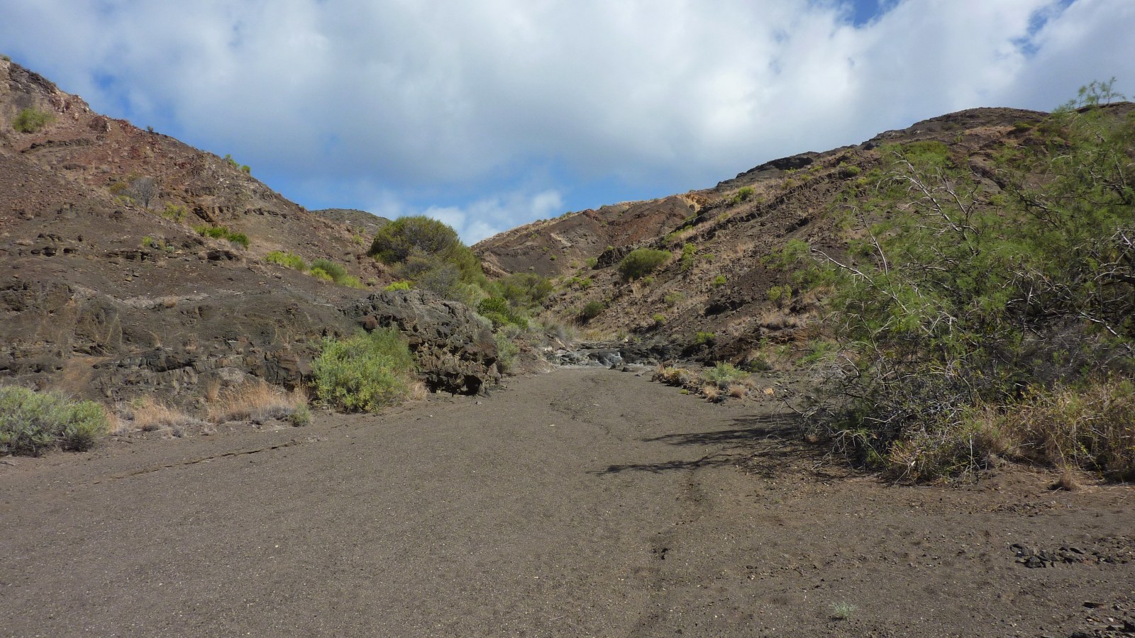 Wir steigen in das Barranco hinab und befinden uns unterhalb der (02) Caseria Cubada (128 m). Zwischen dem Barranco mit Palmen und einer hohen Steinmauer verläuft der Wanderweg ein kurzes Stück rechts. Im weiteren Verlauf geht es über die Terrassenfelder bis zu einer Weggabelung. Wir steigen links direkt im Barranco auf, bis wir auf eine Betonplatte treffen, die mit einem Steinmännchen markiert ist. In westlicher Richtung - oberhalb der links von uns liegenden Häuser - macht der Pfad nach 300 m eine Rechtskurve. Wir erreichen ein großes Wasserauffangbecken, an dem wir rechts in das breite und sandige Barranco steigen.