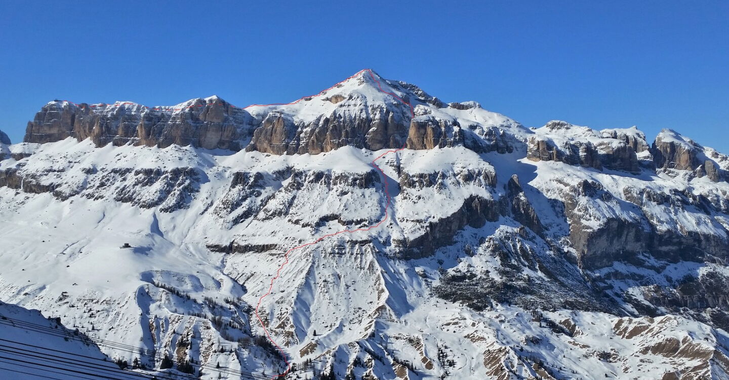 Nach der Pordoi-Seilbahn Nr. 120 fahren wir zum Rifugio Forcella Pordoi ab. Von hier geht es geradeaus weiter, dem Bandwurm zum Mittagstal folgend, bis wir dann abschnallen, um den Piz Boè zu besteigen.
