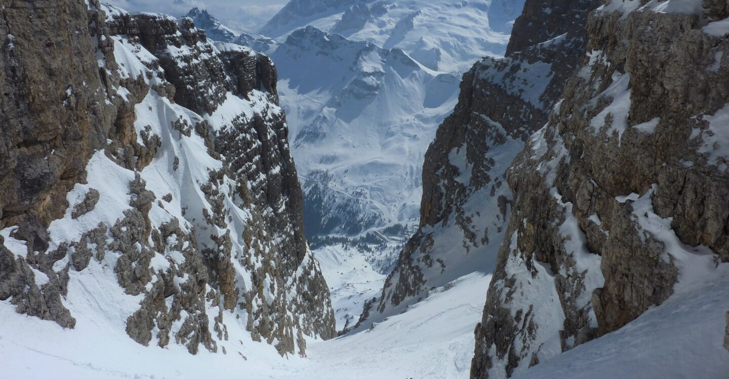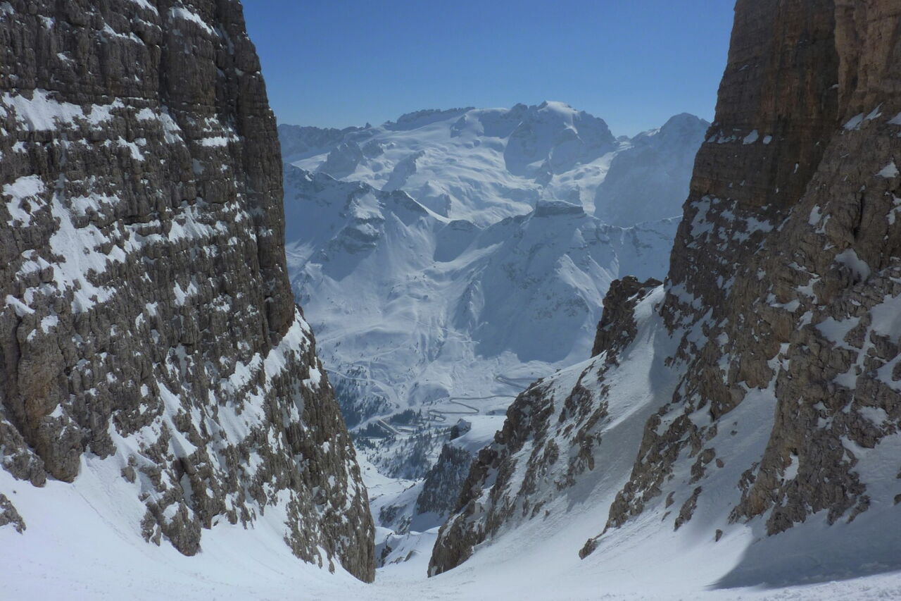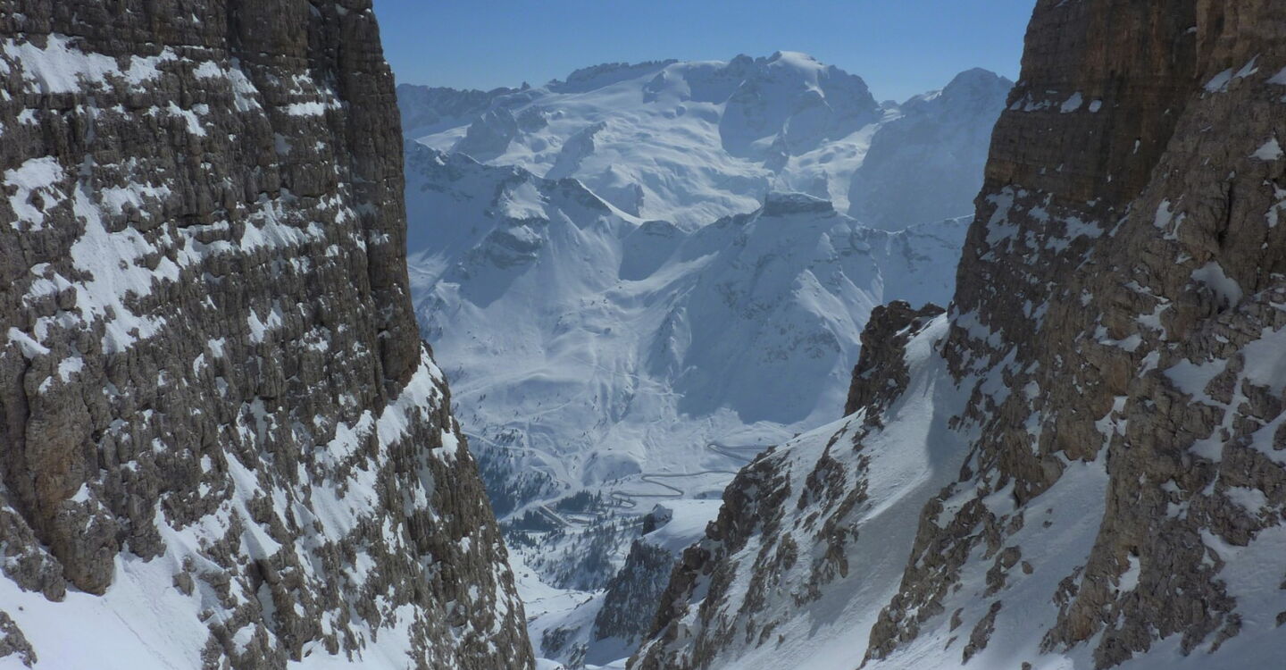 An der südöstlichen Flanke des Piz Boè fahren wir zum Einstieg ins nicht zu verfehlende Val de le Fontane, von wo man traumhafte Ausblicke auf die Marmolada und bis hinunter auf die Straße hat.