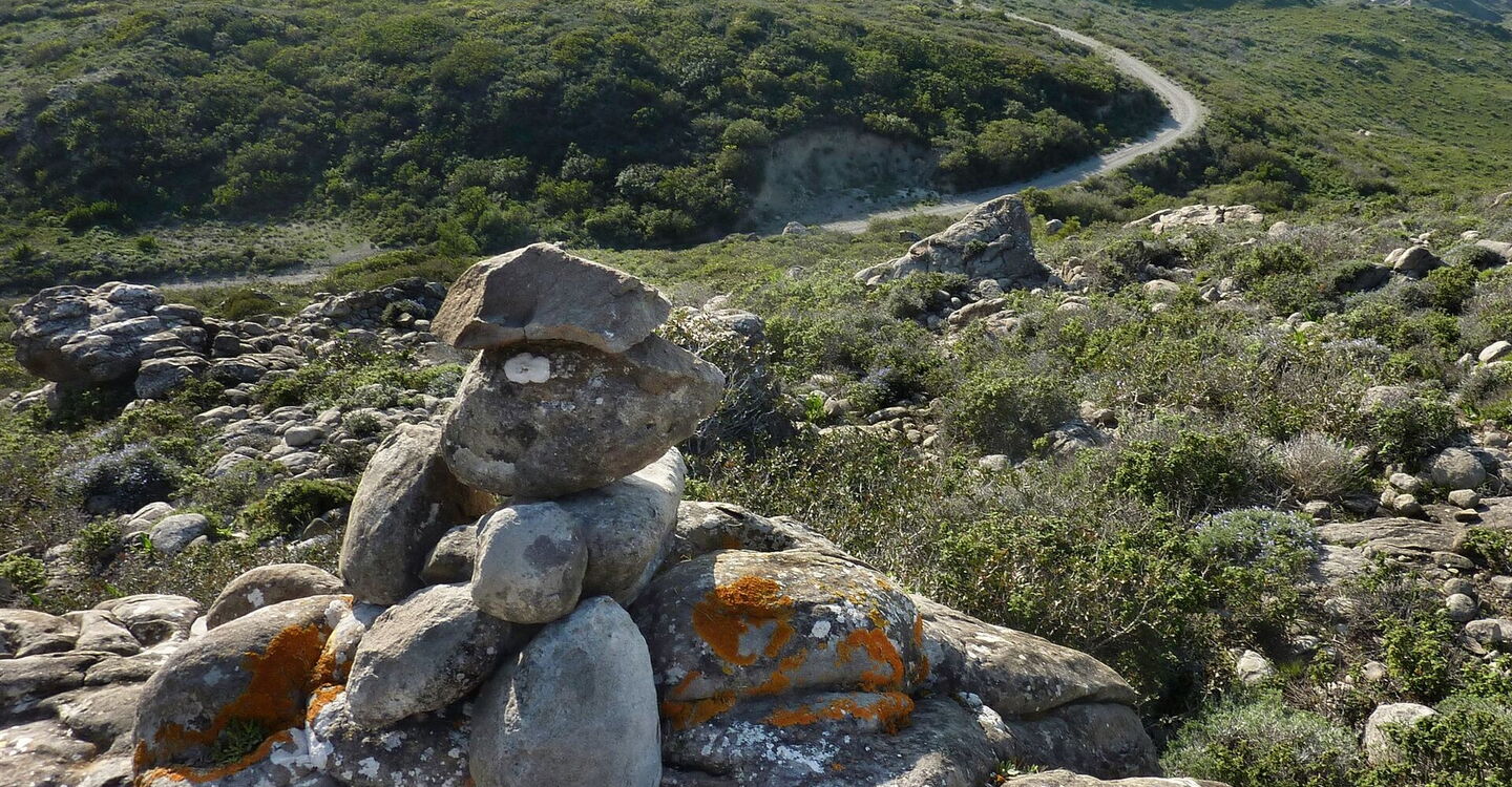 Vom Gipfel gehen wir weiter Richtung Windräder zu einer Einsattelung herunter und im weiteren Verlauf überschreiten wir weitere 3 Hügel. In der dann folgenden Senke befindet sich das erste Steinmännchen. Hier quert halb rechts ein Ziegenpfad den Hang. An dieser Stelle beginnt der (04) Abstieg (447 m). Im weiteren Verlauf treffen wir auf weitere Steinmännchen, bis wir bei einem gut sichtbaren Steinmännchen den Bergrücken überqueren. Unterhalb sehen wir schon die Schotterpiste. Hinter dem Bergrücken gehen wir zunächst links, um nach 20 m rechts zu einem Steinmännchen zu queren und nun durch den steilen, mit Buschwerk durchsetzten Hang bis zur Piste abzusteigen.