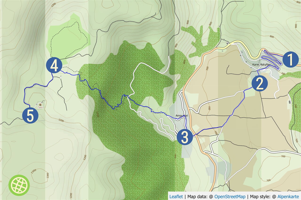 Wir gehen noch einige Meter links auf der Hauptstraße, um dann auf der gegenüberliegenden Straße in das Dorf zu gelangen. Nach 100 m erreichen wir den 03 Supermarkt (727 m), der ab 8:00 Uhr geöffnet ist. Wir gehen weiter durch das Dorf hindurch bis zu einem großen Platz, dort links, um dem gepflasterten, bergauf führenden Weg Richtung Tavri zu folgen. In der ersten Linkskurve verlassen wir die Straße auf den ausgeschilderten Pfad.