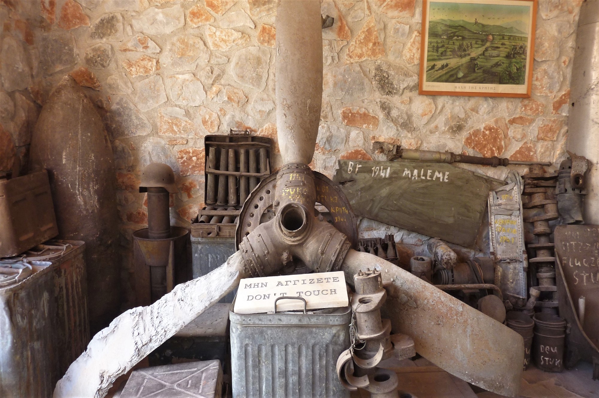 Nach 100 m erreichen wir das rechts oberhalb liegende 02 Kriegsmuseum Askifou (689 m). Ein sehr lohnenswerter Abstecher, denn es werden mehr als 2000 Exponate aus der Zeit zwischen 1940-1944 gezeigt. Andrew G. Hatzidakis, der Sohn eines Kriegsveteranen, hegt und pflegt die Exponate und hält somit die Geschichte am Leben. Wir gehen auf dem eingeschlagenen Weg durch die Rechtskurve und lassen den ersten linken Abzweiger liegen, biegen dann aber bei der folgenden Weggabelung mit der großen Eiche links ab. Bei einer kleinen Kreuzung mit einem Wasserhaus gehen wir rechts und sofort wieder links, um dann nach 150 m rechts leicht bergauf bis zur Hauptstraße vorzugehen.
