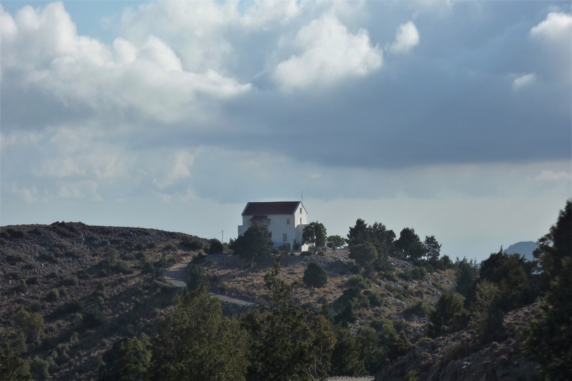 Durch einen lichten Bergwald aus Kiefern und Kermeseichen geht es in engen Kehren bergauf. Hinter einem Ziegengatter erreichen wir eine Hochebene und gehen rechts an dem vor uns liegenden Haus vorbei. Nachdem wir abermals Ziegengatter passiert haben, gehen wir auf der 04 Forststraße (1136 m) links bergauf.