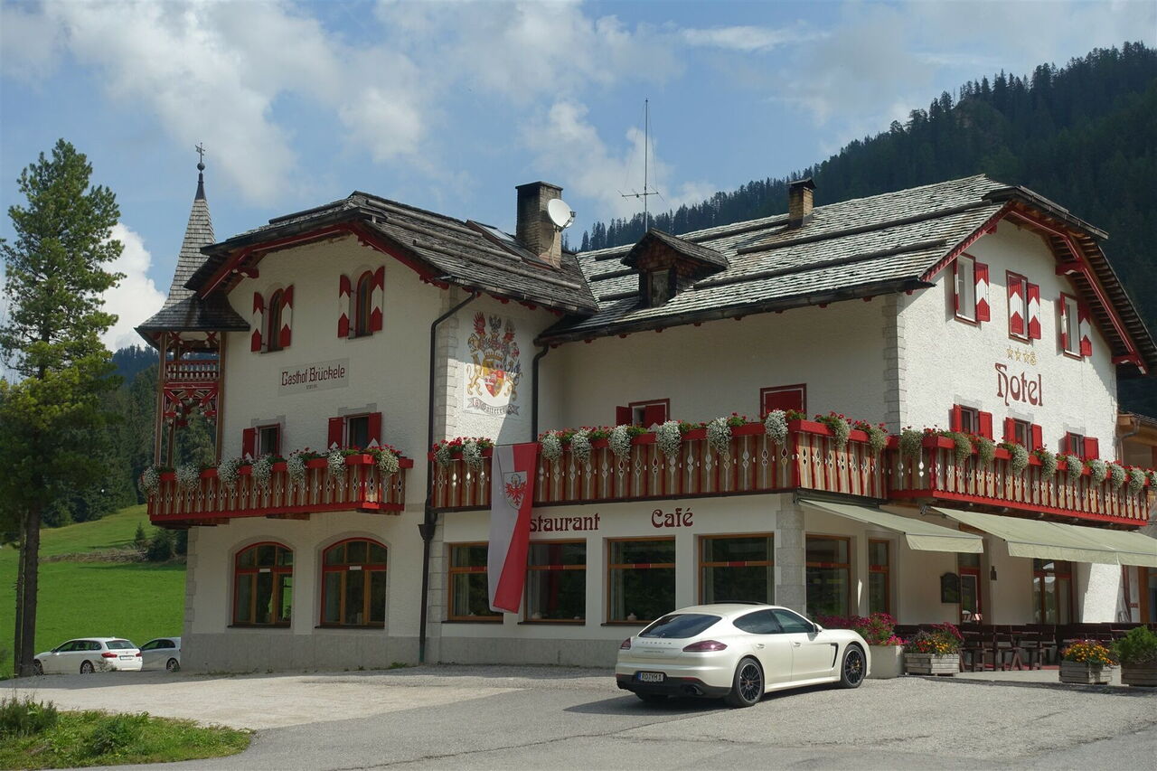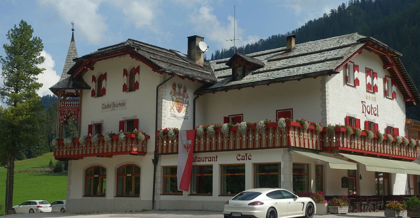 Danach mündet der Lehrpfad wieder in eine Schotterpiste und kurz vor der Straße folgen wir dem halb rechts weiterführenden Wanderweg 37. Dieser bringt uns zur 04 Fermata Ponticello (1.493 m) (Bushaltestelle Brückle) mit einem großen Parkplatz und dem dahinterliegenden Gasthof Brückle. Kehren wir nicht ein, so gehen wir an der Straßenschranke vorbei, über die nachfolgende Brücke und verlassen danach die Straße nach halb rechts, um auf dem Wanderweg 37 weiterzugehen.