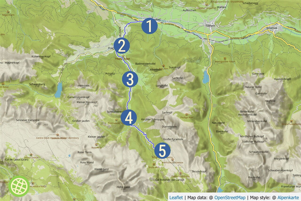 Startpunkt: An der Hauptroute der Bahnstrecke von Deutschland über Österreich nach Italien befindet sich die Bahnstation Franzensfeste, von wo man mit der lokalen Südtiroler Bahnlinie nach Villabassa-Braies (Niederdorf-Prags) fahren kann. Dieses ist einer der zwei möglichen Ausgangspunkte für den Dolomitenhöhenweg 3. Endpunkt/Einstieg/Abbruch: Ca. 300 m entfernt vom Parkplatz für Pkw und Wendeplatz für Busse befindet sich der Berggasthof Plätzwiese. Die Unterkunft befindet sich am Anfang der Touren 59 und 71.