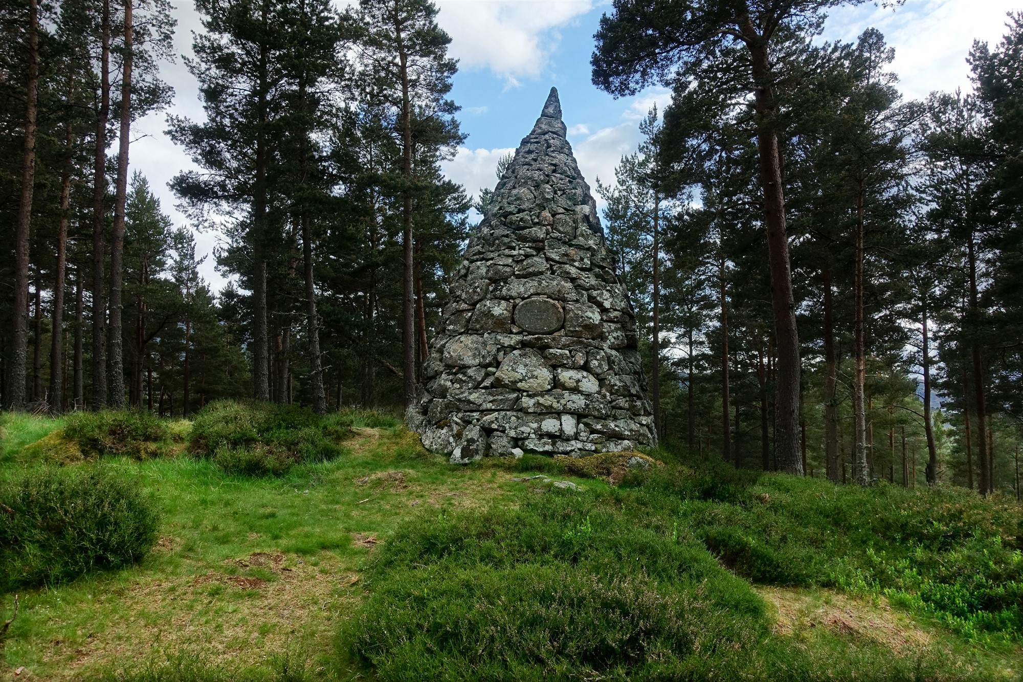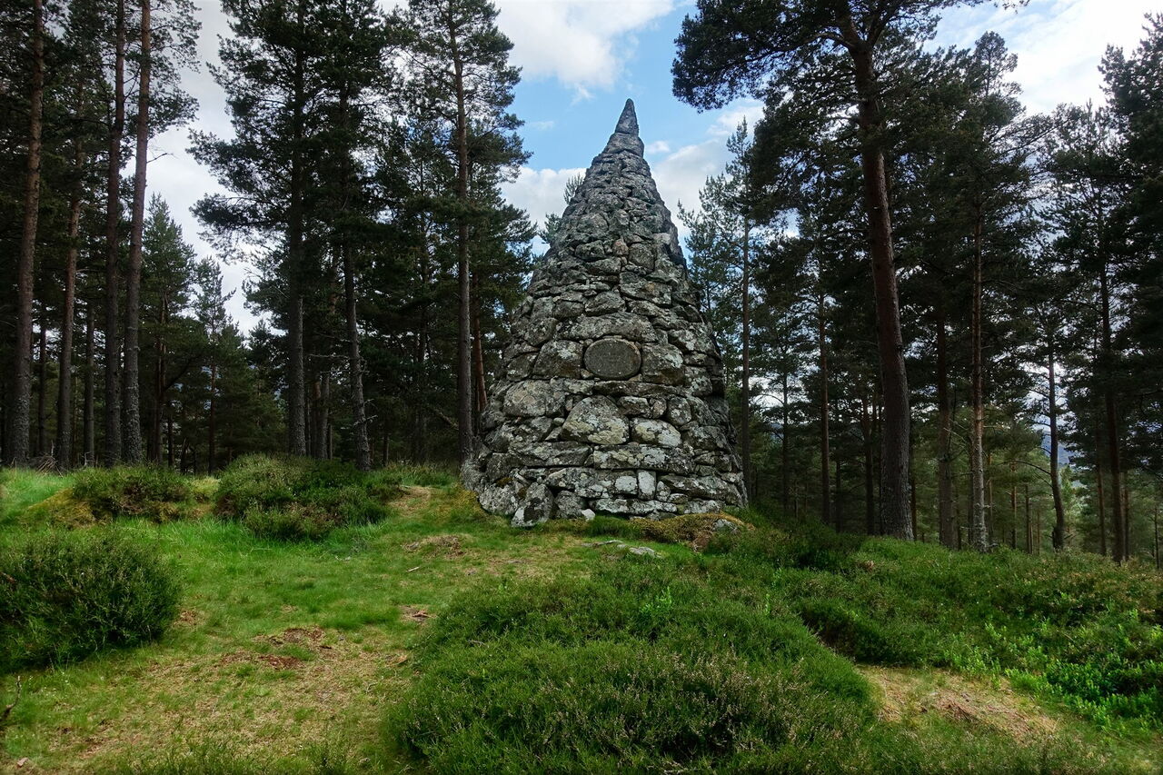 Der weiterführende Pfad endet an einer Forststraße, wir gehen rechts bis zu einer Weggabelung vor. In dieser Senke gehen wir halb links, queren eine Forststraße und gehen geradeaus bergauf durch ein Gatter. Einen rechten Abzweiger, der im weiteren Verlauf über eine kleine Stahlbrücke führt, ignorieren wir, gehen aber nach 20 weiteren Metern steil links. Auf einem unscheinbaren bergauf führenden Pfad erreichen wir den Princess Helena's Cairn (3). Er erinnert an die Heirat zwischen Prinz Friedrich Christian Karl August von Schleswig-Holstein-Sonderburg-Augustenburg und Prinzessin Helena Lenchen – sie war das fünfte Kind der britischen Königin Victoria – am 5. Juli 1866. Wir gehen auf dem Pfad zurück und dann auf dem Hauptweg links weiter und erreichen den links oberhalb liegenden Princess Louise's Cairn (4) – sie war das sechste Kind der britischen Königin Victoria. Der Stein erinnert an ihre Heirat mit John George Edward Henry Douglas Sutherland Campbell, 9. Duke of Argyll oder einfach Marquis of Lorne von 1871. Nach weiteren 200 m befindet sich auf der rechten Seite der 1852 errichtete Steinhaufen Ballochbuie Purchase Cairn (5). Er erinnert an den Kauf des Balmoral Castle und der Ländereien durch Queen Victoria und Prince Albert am 15. Mai 1878. Seitdem gehört das Schloss zum Privatvermögen der königlichen Familie. Bei einer Weggabelung gehen wir halb rechts und erreichen den 03 Prince Leopold's Cairn (374 m) (6) – er war das achte Kind. Der Cairn erinnert an die Heirat von Leopold mit der deutschen Prinzessin Helene zu Waldeck und Pyrmont am 27. April 1882. Durch diese Heirat wurde sie ein Mitglied der britischen Königsfamilie. Von hier hat man einen gigantischen Blick auf das Balmoral Castle – ein sehr selten gesehenes Fotomotiv.