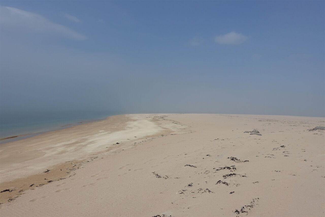 Nachdem wir eine kleine Landzunge und eine sandige Bucht hinter uns gelassen haben, gehen wir nun parallel zum Meeresarm Kyle of Durness. Er ist ungefähr 0,8 km breit und stark von den Gezeiten abhängig, bei Ebbe bleibt nur ein schmaler Kanal mit Wasser übrig. Auf der gegenüberliegenden Seite befindet sich das Cape Wrath. Es folgt der landschaftlich schönste Abschnitt der Wanderung, entlang eines goldgelben feinen Sandstrands und bis zu 20 m hoher Dünen, dekoriert mit grünem Dünengras. Wir gelangen an den ersten Traumstrand 02 Cape Wrath Beach 1 (6 m), der durch ein Riff aus Felsen vom Meeresarm getrennt ist.