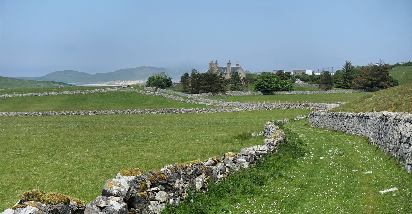 30 m hinter dem letzten Haus, vor der Hauptstraße, gehen wir links durch ein Gatter und quer über die Weidefläche bis zu einem weiteren Gatter, das sich mittig auf der Weide befindet. Wir gehen weiter in der eingeschlagenen Richtung, steigen bis zu einer Anhöhe auf und gehen bis zu einer Stelle vor, wo sich zwei überirdische Stromleitungen kreuzen. Von dort gehen wir halb rechts bis zur Hauptstraße, steigen über einen niedrigen Zaun ohne Stacheldraht und laufen 400 m auf der Straße Richtung Durness. Wir nehmen den nächsten linken Abzweiger mit dem Wegweiser Richtung Old Manse Track. Über einen schönen grasbewachsenen Pfad, gesäumt mit alten Steinmauern, erreichen wir das 04 Balnakeil Craft Village (45 m). Hier haben sich Künstler, Handwerker und ihre Familien angesiedelt und verkaufen ihre Kreationen – ein netter Zwischenstopp.