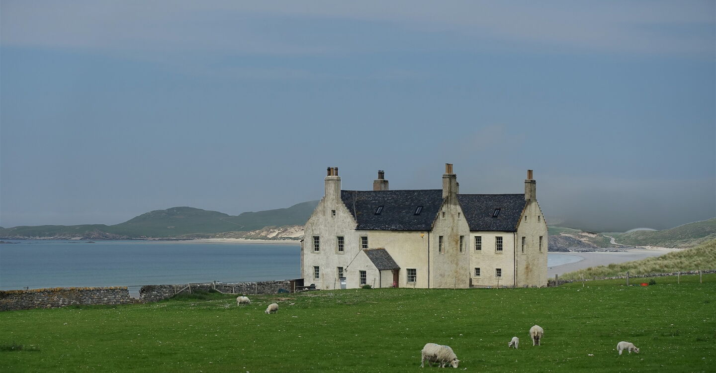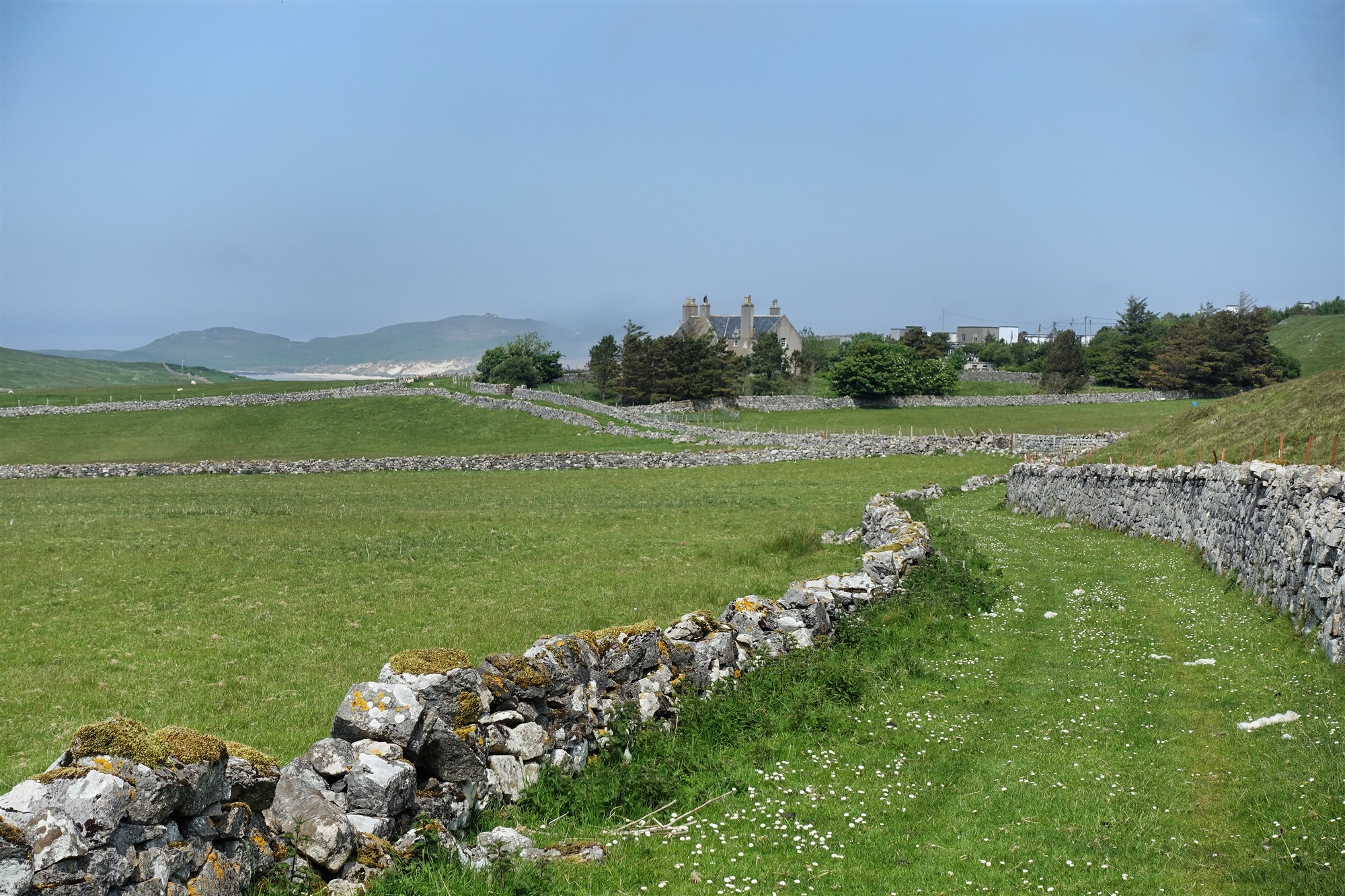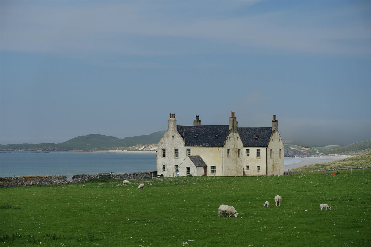 Der Pfad mündet in die Rechtskehre einer Nebenstraße, auf der wir Richtung Ausgangspunkt wandern. Von der nachfolgenden Anhöhe sehen wir bereits halb rechts das 05 Balnakeil House (21 m). Es wurde zwischen 1720 und 1744 auf den Ruinen des früheren Sommerpalastes der Bischöfe von Caithness errichtet. Auf dem Gelände des Hauses befand sich früher eine Wassermühle, der ummauerte Garten von 1863 ist heute noch erhalten.