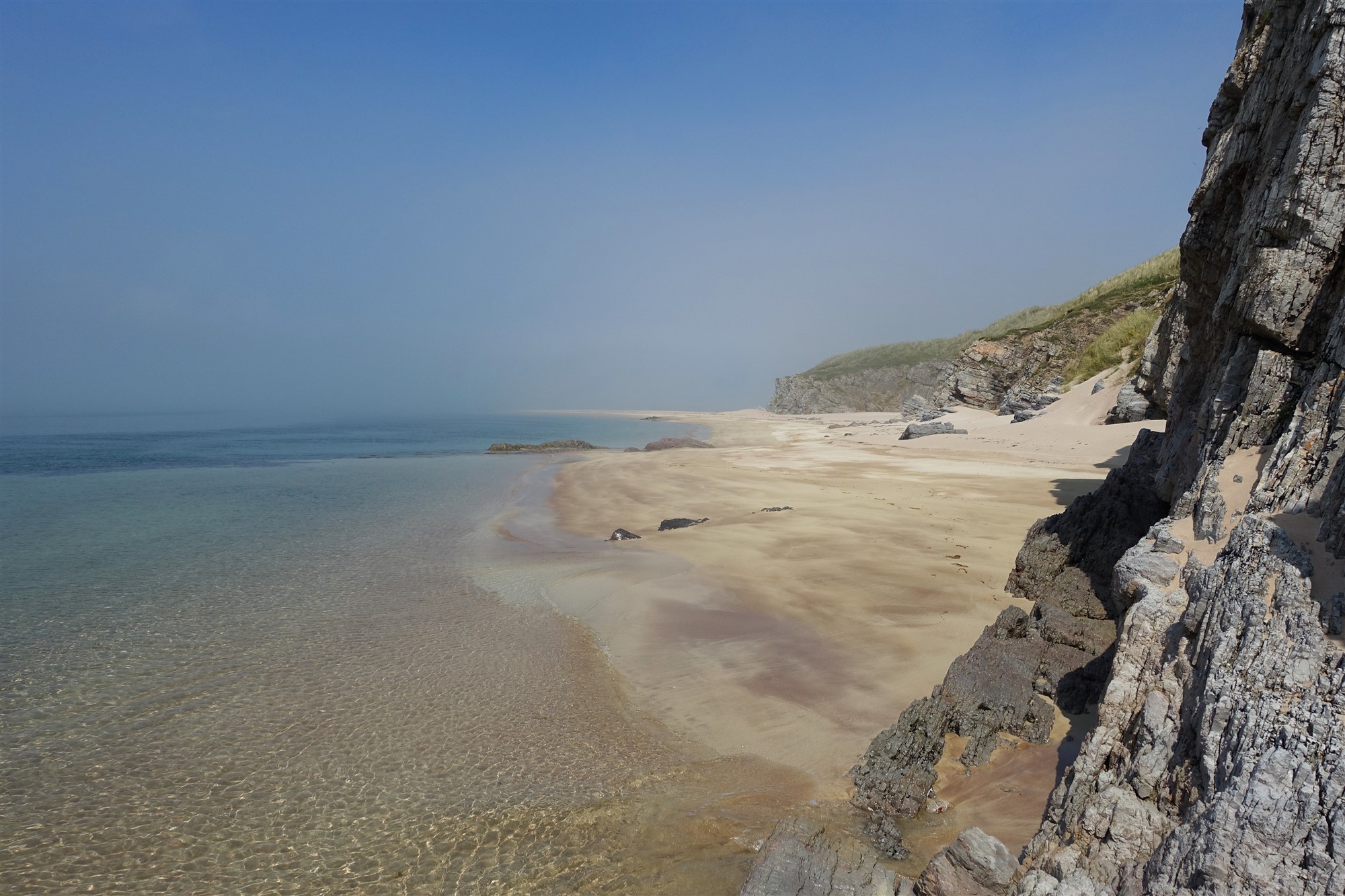 Je nach Stand der Gezeiten kann man auf dem folgenden Abschnitt am Strand laufen, bei Flut müssen wir über Felsen steigen. An dieser Stelle ist kein Pfad zu erkennen, man muss sich den eigenen Weg suchen. Nach 200 m steigen wir wieder zum Strand herunter und erreichen den zweiten Traumstrand 03 Cape Wrath Beach 2 (14 m). Dieser Wegabschnitt führt zwischen 20 m hohen Klippen und einem seicht ins Wasser führenden Strandabschnitt entlang. Sobald wir auf einen weiteren felsigen Abschnitt zugehen, steigen wir an geeigneter Stelle – es gibt hier keinen Pfad – auf die Klippen und gehen nun oberhalb dieser bis zu einer kleinen Schlucht. Dort gehen wir landeinwärts, queren die Schlucht und passieren einen elektrischen Zaun. Der Küstenpfad endet an einem Weidegatter und wir gehen auf der Straße am Parkplatz vorbei.