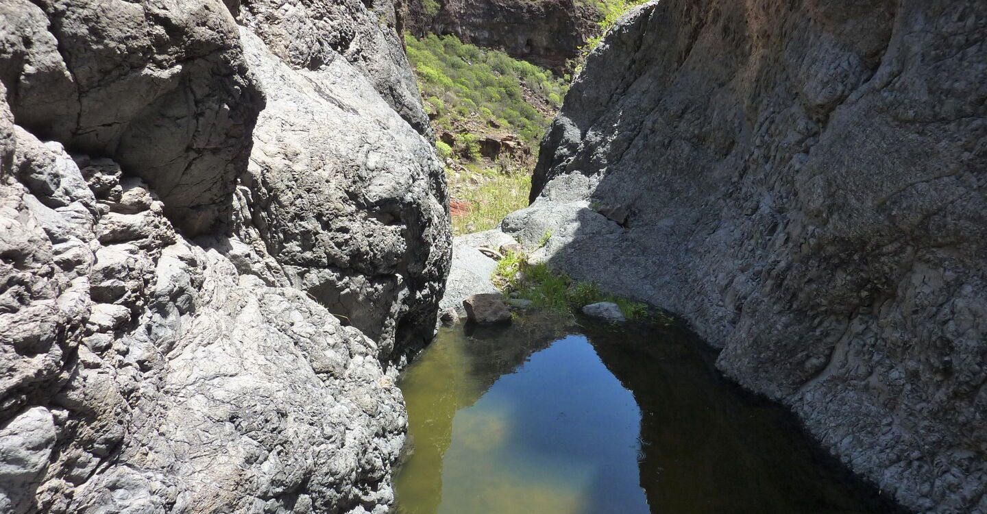 In diesem unwegsamen, weglosen und steilen Gelände steigen wir nun zur (03) Schlüsselstelle bei den Palmen (362 m) ab. Auch an dieser Stelle müssen wir einen unüberwindbaren Wasserfall umgehen. Dazu queren wir das Barranco und gehen - ohne dabei an Höhe zu verlieren - auf der rechten Flussseite talauswärts, bis der Weg eine 90°-Wendung nach rechts macht. An dieser Stelle können wir uns einen Abstiegsweg direkt in das Barranco bahnen. Aber auch nach diesem Abstieg wird uns keine Atempause gegönnt, denn nur einige Meter weiter mündet das Barranco in eine tiefer liegende Gumpe. Bei wenig Wasserstand kann man in diesem trockenen Flussbett einige Meter absteigen, um dann links über rotes Gestein die Gumpe zu umgehen.