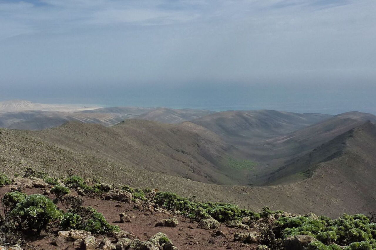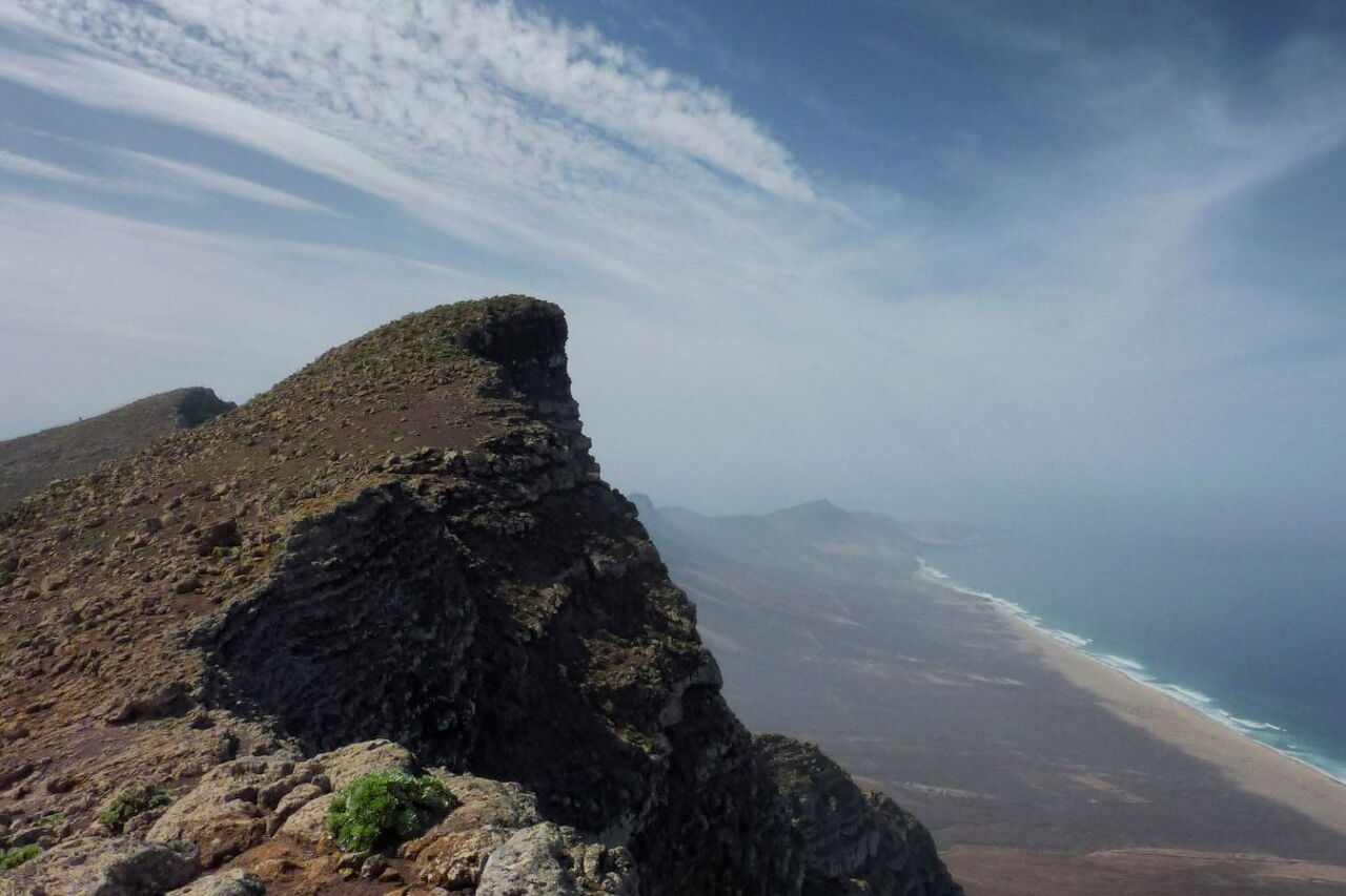 Die Besteigung des zweithöchsten Berges der Insel kommt einer Hochgebirgstour in den Alpen schon sehr nahe. Mit 755 Höhenmetern und knapp 14 km Länge ist sie auch sehr sportlich. Unsere Wanderung beginnt auf einfachen Wegen in einem mächtigen Schluchtauslauf, dem Barranco Esquinzo im Jandia-Bergmassiv im Süden von Fuerteventura. Zunehmend verschlechtert sich der Weg, bis wir die schwierigste Stelle erreichen, einen 7 m hohen Wasserfall – ein sehr beeindruckendes Potpourri aus verschiedenen Gesteinsfarben. Der 360°-Rundblick vom Gipfel lässt jeden innehalten. Über sanfte Hügelketten geht es zurück zum Ausgangspunkt.