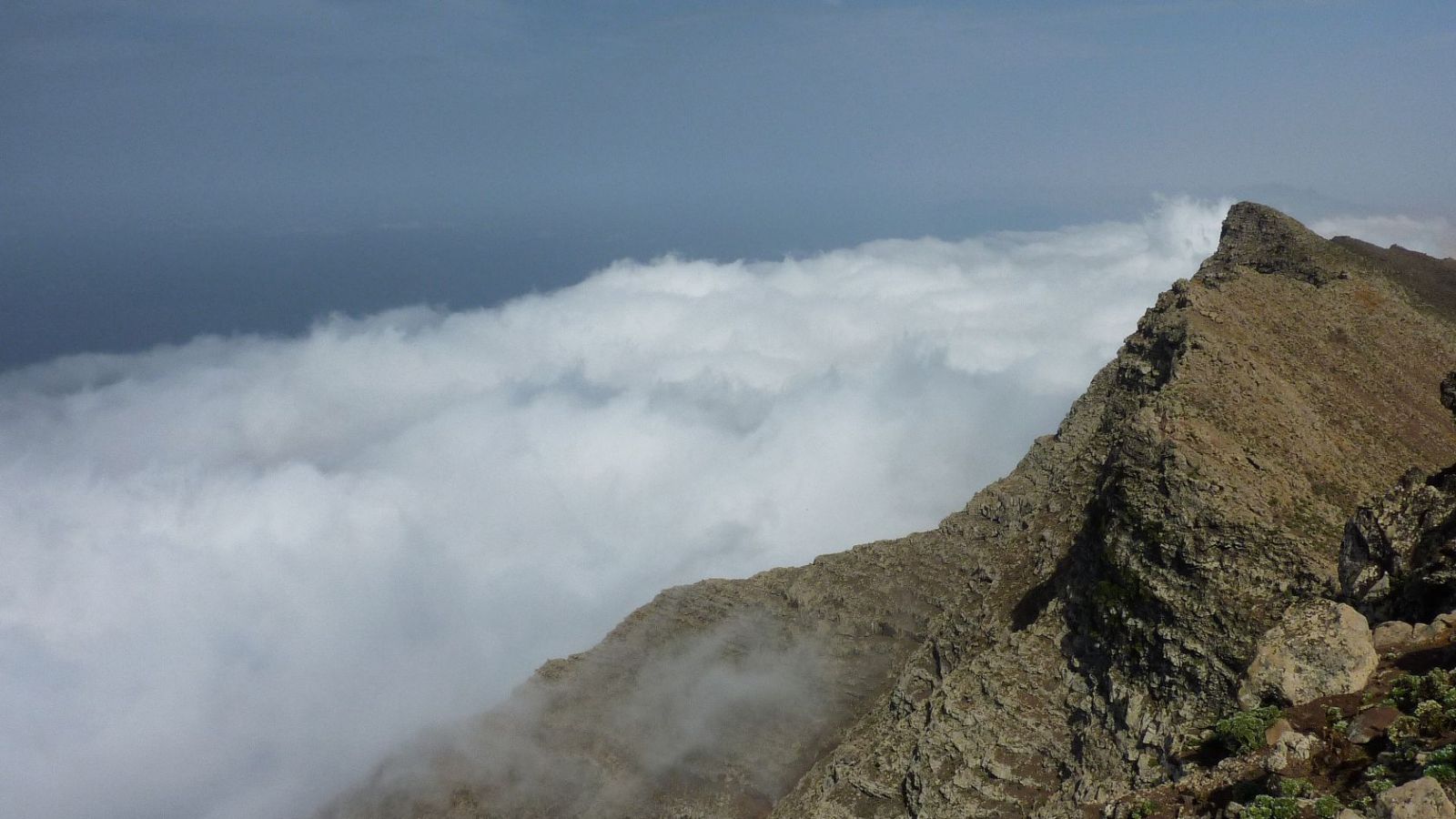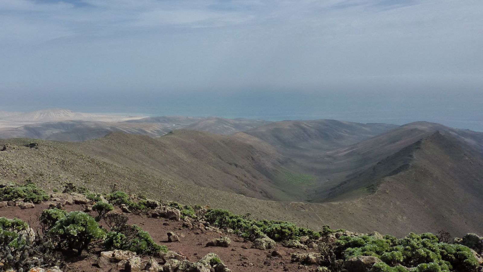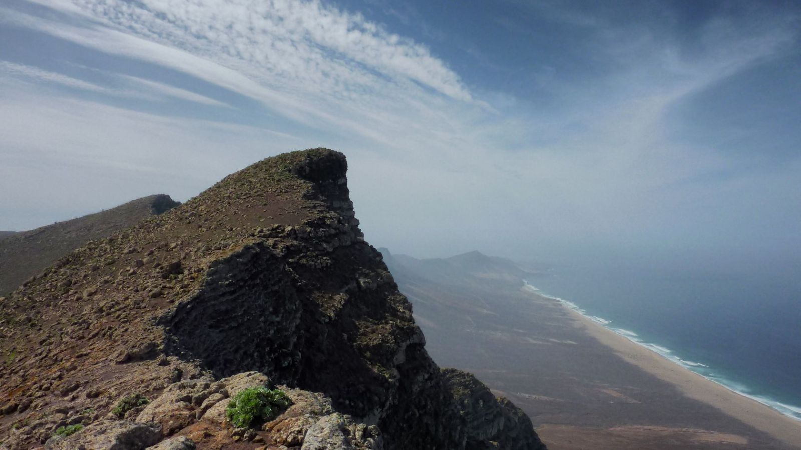 Anschließend gehen wir rechts auf dem Bergrücken bis zu einer Steinruine vor und orientieren uns beim weiteren Aufstieg an der Grundstücksbegrenzungsmauer, bis wir den Grat erreicht haben, der bis zum Gipfel reicht. Auf diesem gehen wir halb links bis zum Gipfel des (03) Pico de Mocan (792 m) vor. Der 360°-Rundblick lässt uns innehalten. Während die Hänge des Jandia-Bergmassivs nach Nordwesten – Richtung Playa Cofete und Playa Barlovento – extrem steil abfallen, neigen sie sich gemächlich Richtung Südosten.
