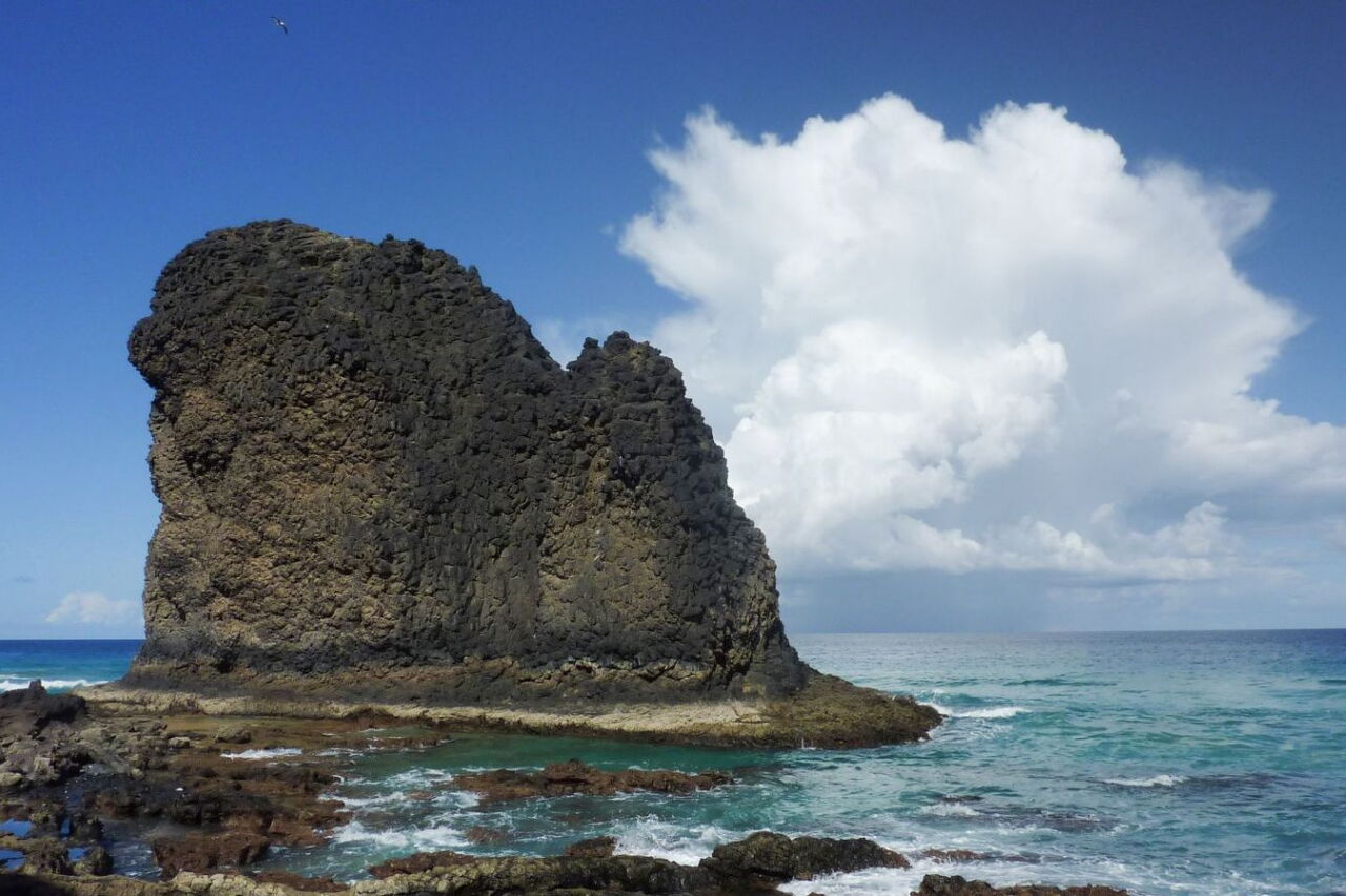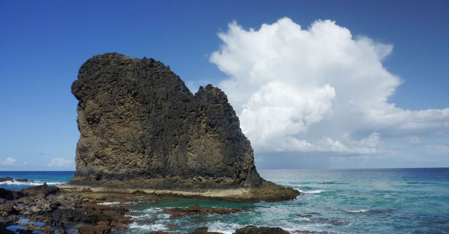 Bei Niedrigwasser ist der Strand gute 150 m breit. Wir gehen nun links in Richtung der 36 m hohen Felsformation, dem (04) Roque de Moro (6 m). Wie lässt sich dieses Phänomen erklären? Was wir vor uns sehen, ist das erstarrte Magma, welches nicht ausgeworfen wurde. Im Laufe der Jahrtausende hat die voranschreitende Korrosion das weichere Gestein abgetragen und nur die erstarrte Felssäule stehen lassen.
