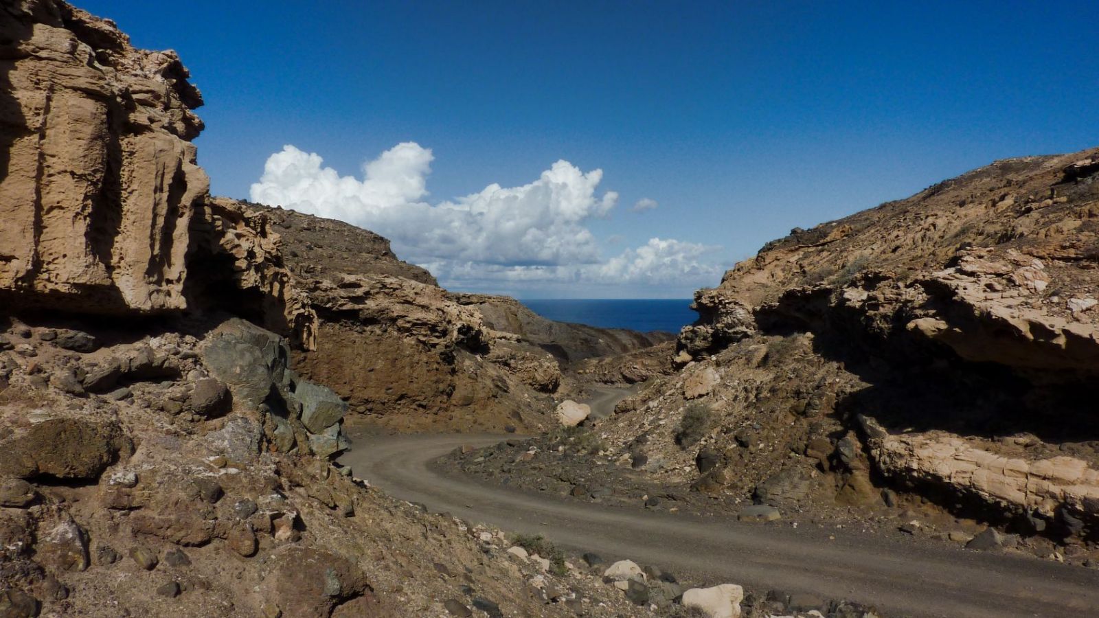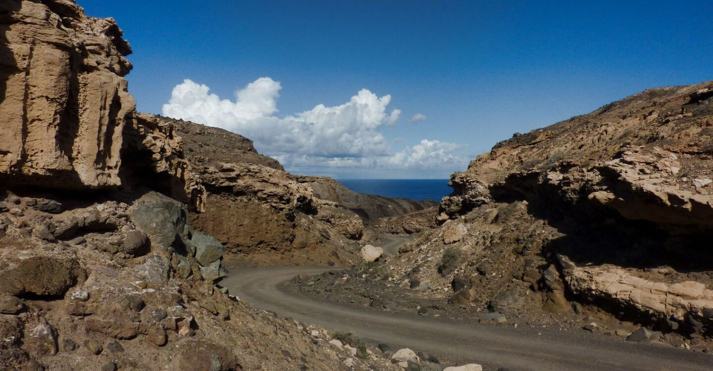 Busanbindung: keine. Mit dem Pkw fährt man 38,5 km von der Costa Calma zum Start. Wir fahren auf der FV-2, bis wir oberhalb des Hafens rechts Richtung Playa Cofete abbiegen. Beim rechts von uns liegenden Friedhof beginnt die Schotterstraße. Bei der Abzweigung – links geht es Richtung Faro de Jandia und Puertito de la Cruz – fahren wir rechts weiter Richtung Playa de Cofete. Exakt 2,4 km nach dem Aussichtspunkt Degollada de Agua Oveja zweigt links eine Schotterstraße zum Meer ab. Hier befindet sich eine kleine Parkbucht. Geokoordinaten Parkplatz: 28.092567 -14.416733.