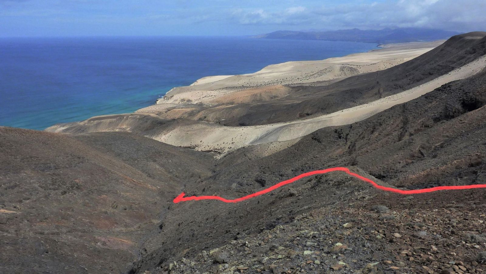 Nach nur 100 m Aufstieg auf einem schmalen Pfad gehen wir rechts auf dem vor uns liegenden (04) Bergrücken (190 m) mittig bergab. Nach weiteren 300 m steigen wir an einer günstigen Stelle in das Barranco hinab und folgen der Falllinie. Am Ende des Barrancos treffen wir auf einen Küstenpfad, dem wir links 400 m folgen.