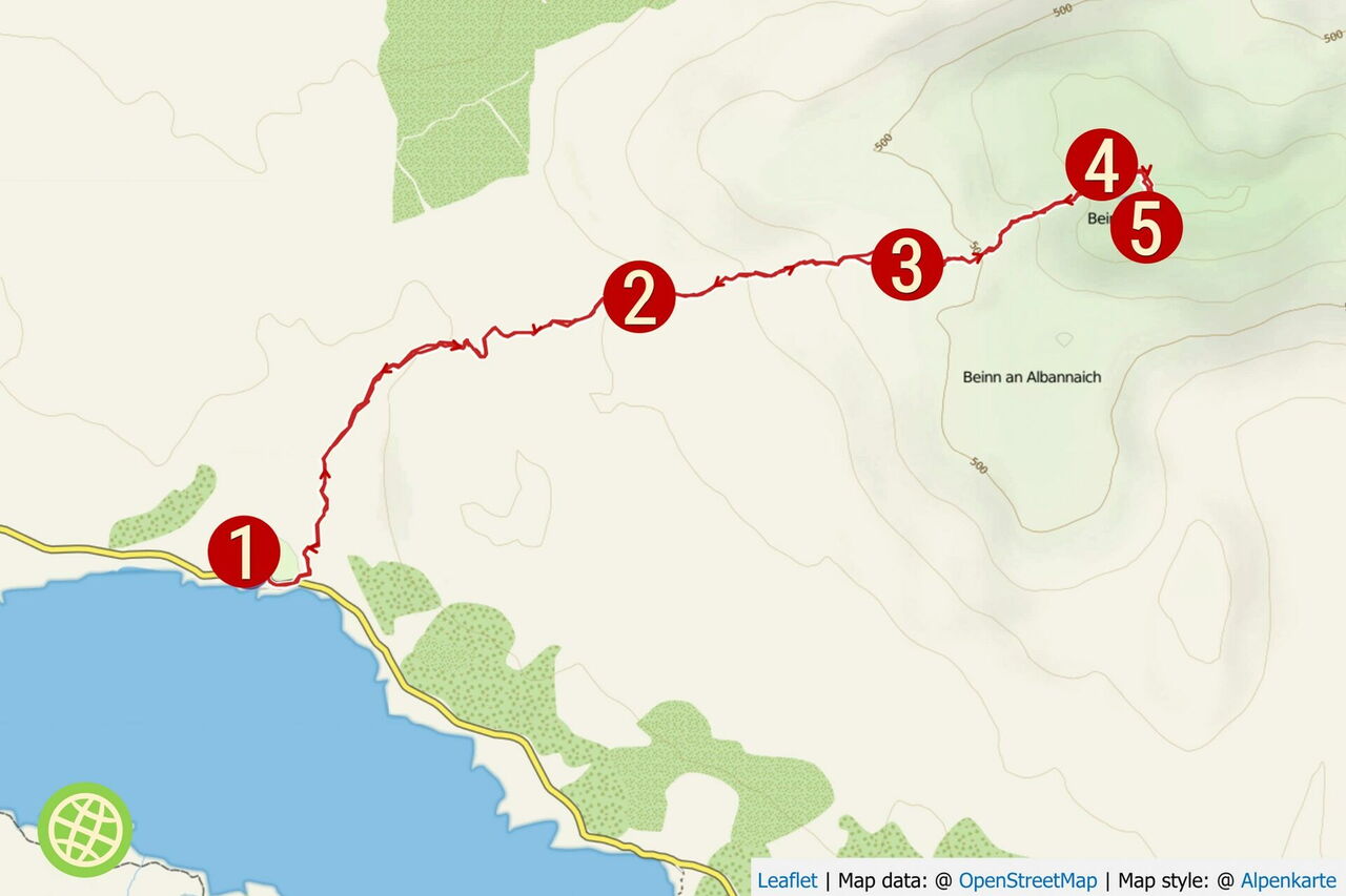 Vom 01 Start und Ziel (5 m) gehen wir auf der Anfahrtsstraße zum Campingplatz vor und direkt an der Rezeption des Campingplatzes vorbei, um hinter diesem Gebäude rechts durch einen kleinen Eichenwald den Aufstieg zu beginnen. Bei der darauffolgenden Weggabelung – links schaut man zum Campingplatz herunter – gehen wir halb rechts, weiter über die kleine Brücke und durch ein erstes und ein zweites Gatter. Auf dem nachfolgenden Fahrweg gehen wir nicht links, sondern geradeaus weiter. Einen Abzweiger nach rechts, vor einer großen Eiche, ignorieren wir. Bei der nachfolgenden Anhöhe kann man bereits in der Ferne den Gipfel des Beinn Resipol ausmachen. In einer Rechtskehre ignorieren wir den linken Abzweiger vor dem Gatter.