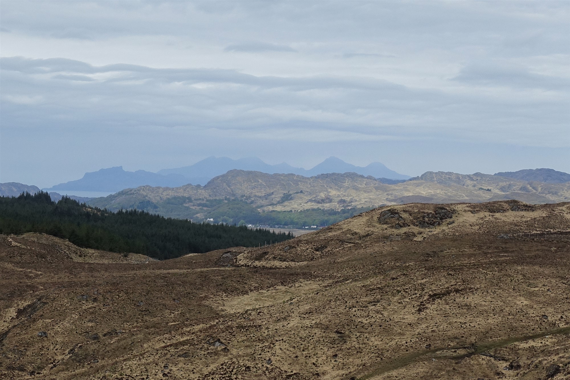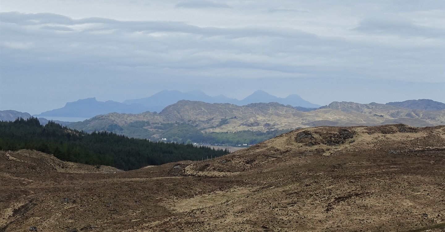 Ein kurzes Stück gehen wir auf einem gut präparierten Weg. Links kann man bereits die felsige Gebirgslandschaft der Insel 02 Skye (207 m) ausmachen, die zu den Inneren Hebriden gehört. Bei einer Weggabelung gehen wir nicht rechts entlang des kleinen Grabens, sondern auf dem weiterführenden Pfad Richtung Gipfel. An dem darauffolgenden Gatter – davor befindet sich ein kleiner Bachlauf – wandern wir rechts auf dem Pfad weiter. Nach längeren Regenfällen ist besonders dieses Wegstück extrem sumpfig. Man muss dann mitunter öfters vor- und zurückgehen, um den richtigen Weg zu finden.
