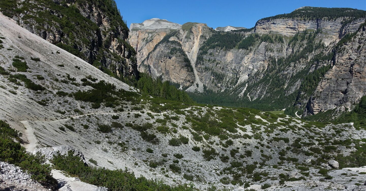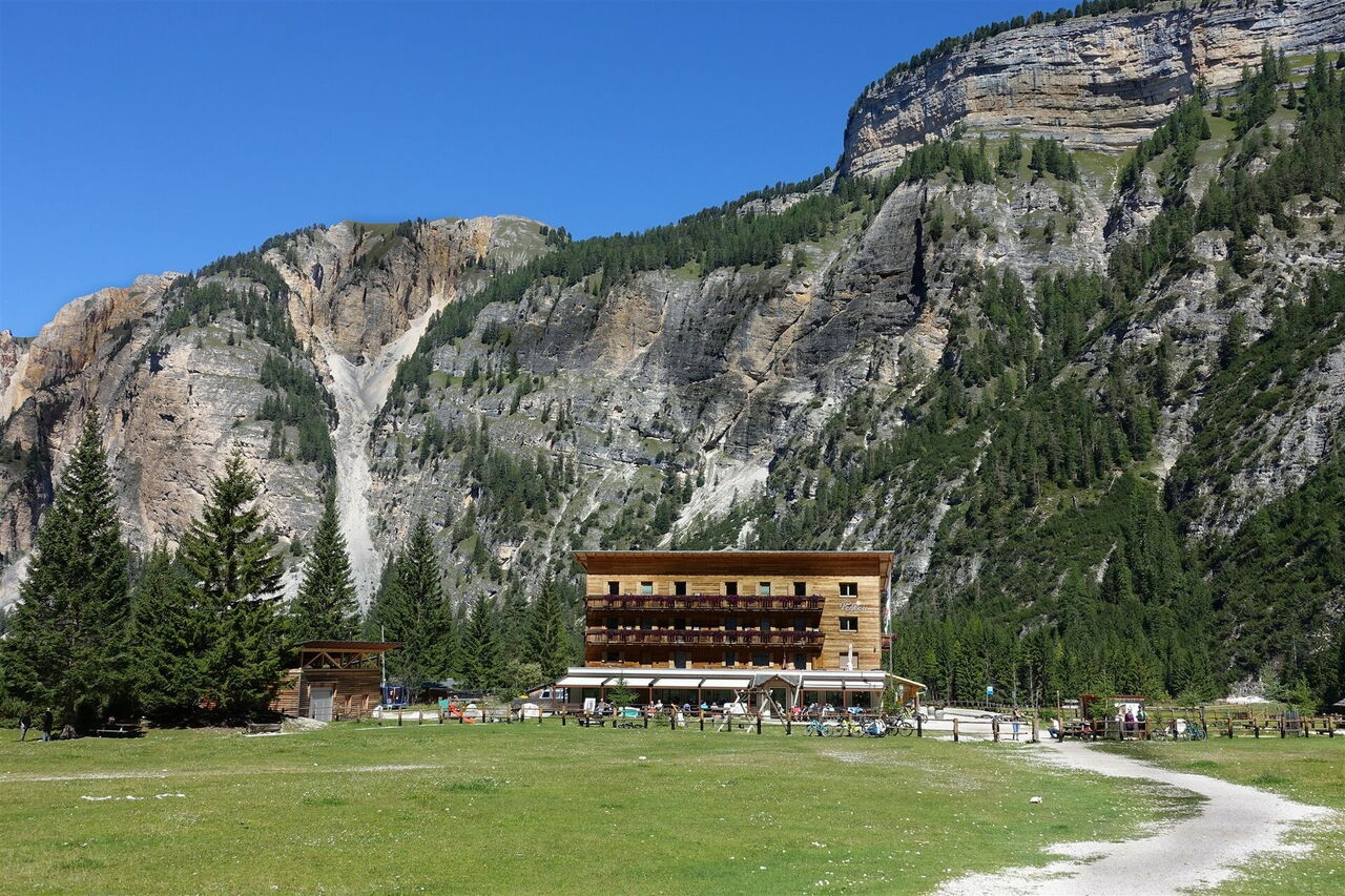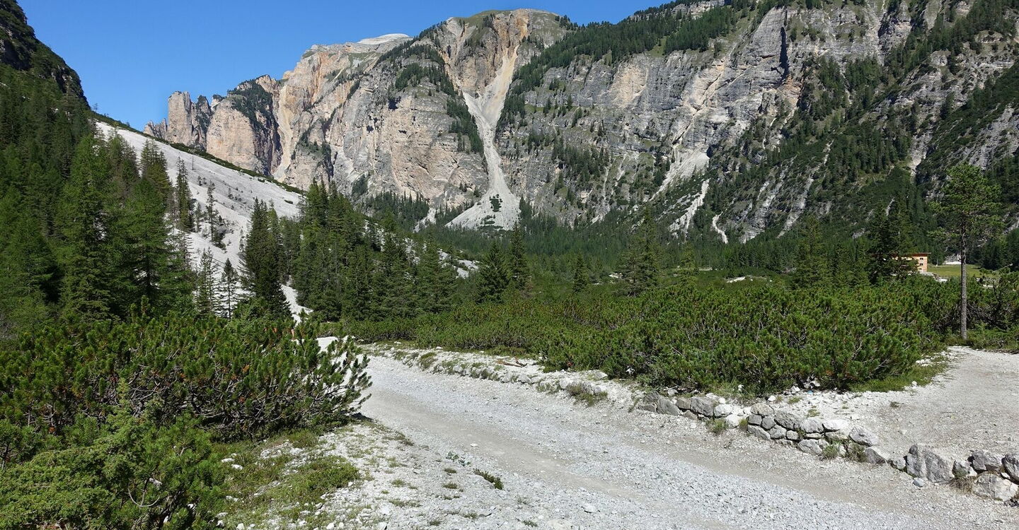 Vom 01 Berggasthaus Pederü (1.545 m) gehen wir ca. 100 m auf dem Kieselsteinweg (Wanderweg 7) in südliche Richtung, bevor wir den Bachlauf über eine Brücke queren. Dahinter gehen wir links und marschieren durch Latschenkiefern bergauf, weiterhin auf einem Kieselsteinweg. Zwischenzeitlich überqueren wir eine Schotterpiste, die bis in das Hochtal des Fanes-Sennes-Prags-Naturparks führt. Alternativ kann man auch auf der Schotterpiste bergauf gehen, die nachfolgende Beschreibung gilt für den kürzeren und schöneren Wanderweg. Der nachfolgende Pfad ist mit Holzpfosten befestigt, da der komplette Hang abgerutscht war.