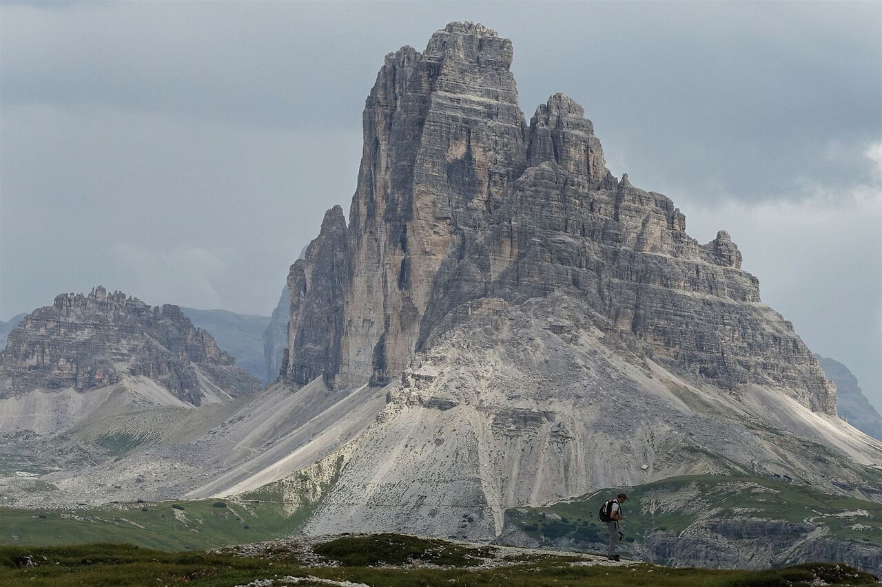 Bei guter Fernsicht ergibt sich bereits vom Berggasthof Plätzwiese eine faszinierende Aussicht auf die 3.146 m hohe Nordostflanke der Hohen Gaisl, die die Italiener aufgrund des auffälligen roten Gesteins Croda Rossa d’Ampezzo nennen. Vom Fuße dieses höchsten Gipfels der Pragser Dolomiten steigen wir ins Höhlensteintal herunter. Wir befinden uns nun im Reich der Sextner Dolomiten und steigen auf das Hochplateau zwischen dem Monte Piana und Monte Piano. Während des Gebirgskrieges (1915 bis 1917), oft auch Dolomitenkrieg genannt, zwischen Österreich-Ungarn und Italien war dies ein sehr umkämpftes Gebiet. Ca. 14.000 Soldaten, Österreicher und Italiener, ließen ihr Leben an diesem Berg. Am Nordgipfel (Monte Piano) hatten die Österreicher ihre Stellungen, am Südgipfel (Monte Piana) die Italiener. Zur Verteidigung wurden Tunnel, Stollen und Schützengräben errichtet, die heutzutage im Freilichtmuseum Monte Piana besucht werden können. Weitere Fundstücke können in der kleinen Sammlung des Rifugio Maggiore betrachtet werden. Auf dem verbliebenen Wegstück schauen wir direkt auf die Westflanke des meistfotografierten Berges und Wahrzeichens der Dolomiten – die Drei Zinnen (Tre Cime di Lavaredo).