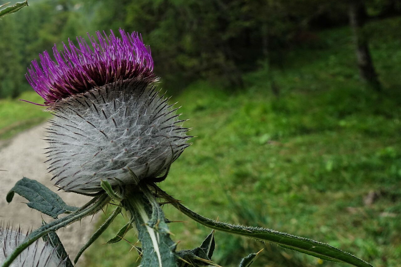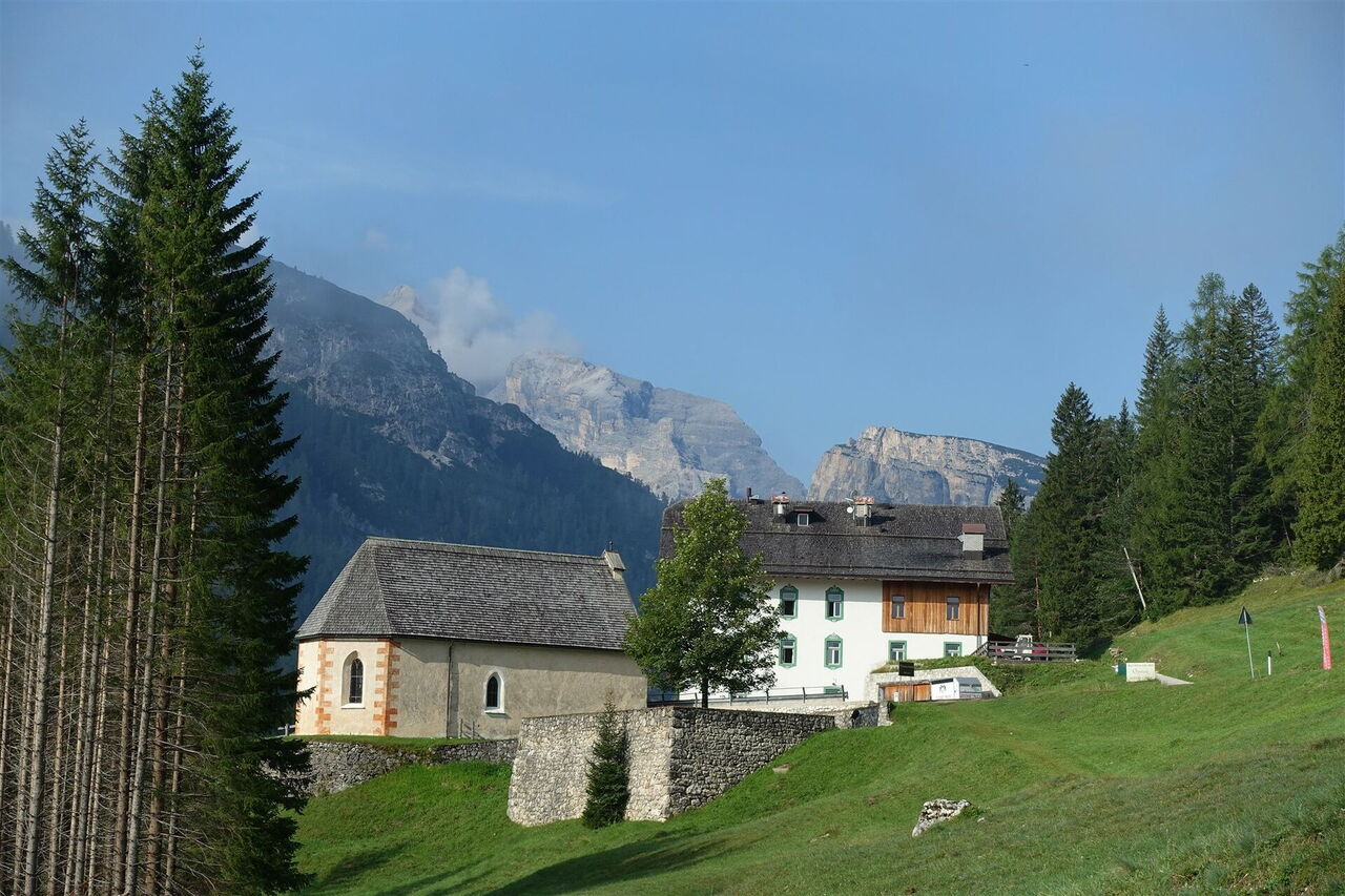 Kurz vor der Straße kommen wir an einer Quelle vorbei. Auf der gegenüberliegenden Straßenseite am 1.530 m hohen Passo Cimabanche (Im Gemärk) befinden sich das kleine Restaurant Cimabanche und auch eine Bushaltestelle. Für die nächsten 3,8 km gehen wir auf dem Fahrradweg an der linken Straßenseite bis nach 02 Ospitale d`Ampezzo (1.484 m). Dort, wo rechts ein Pfad zum Restaurant und Rifugio Ospitale abzweigt, gehen wir auf dem Wanderweg 203 links zum Bachlauf herunter. Wir überqueren die Brücke und folgen dem steil bergauf führenden Forstweg durch die Rechtskehre.