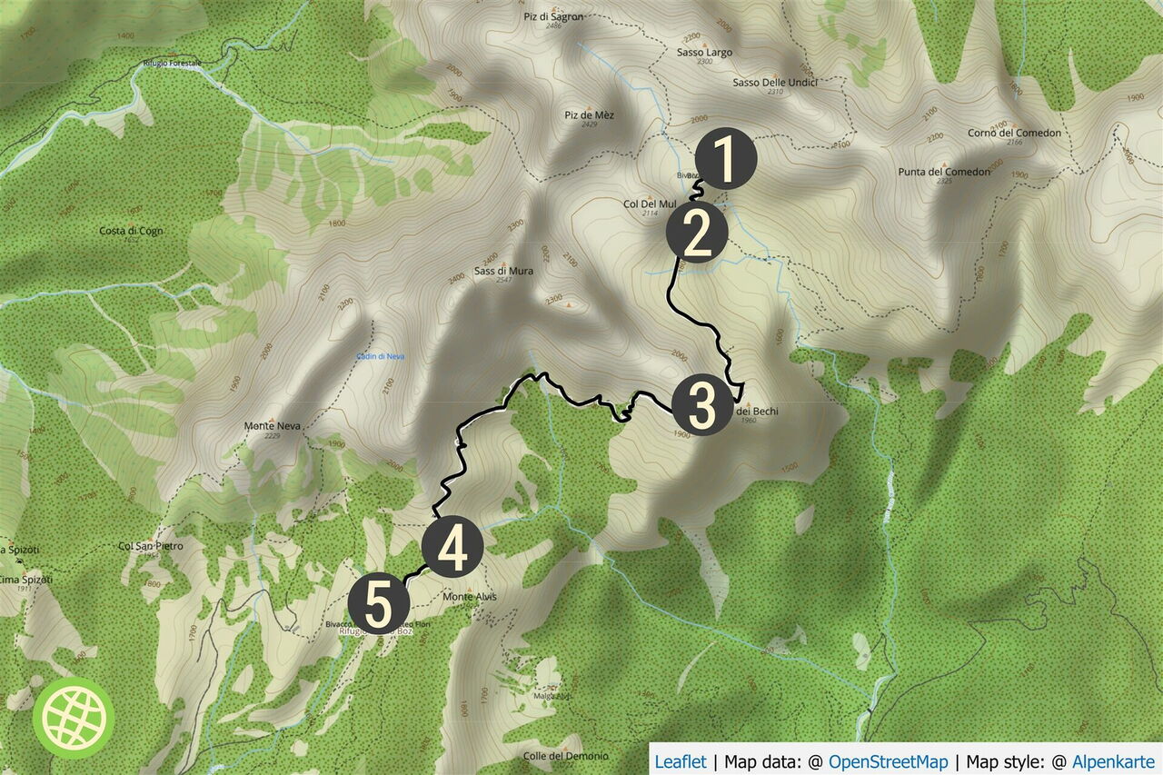 Startpunkt: Das Bivacco Feltre ist nur zu Fuß erreichbar und befindet sich am Ende der Wanderung 46. Endpunkt: das Rifugio Bruno Boz am Anfang der Wanderung 48.