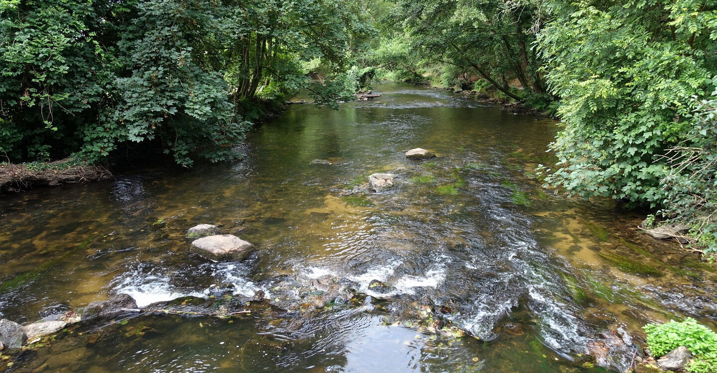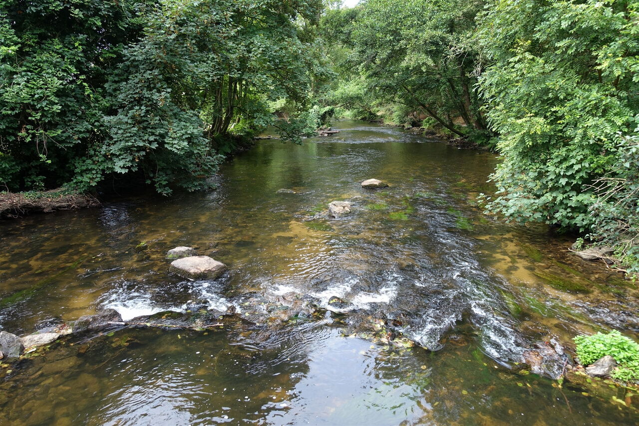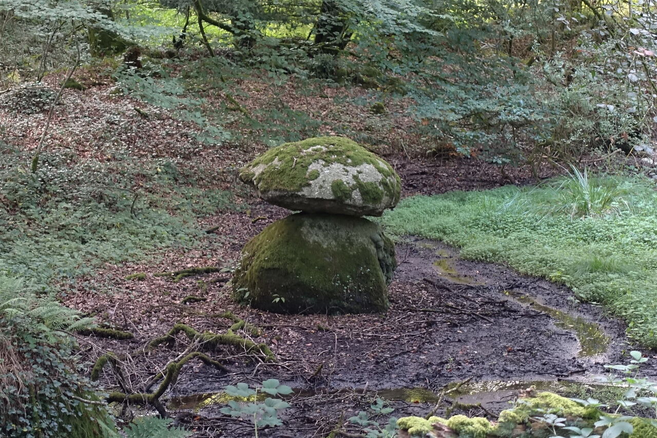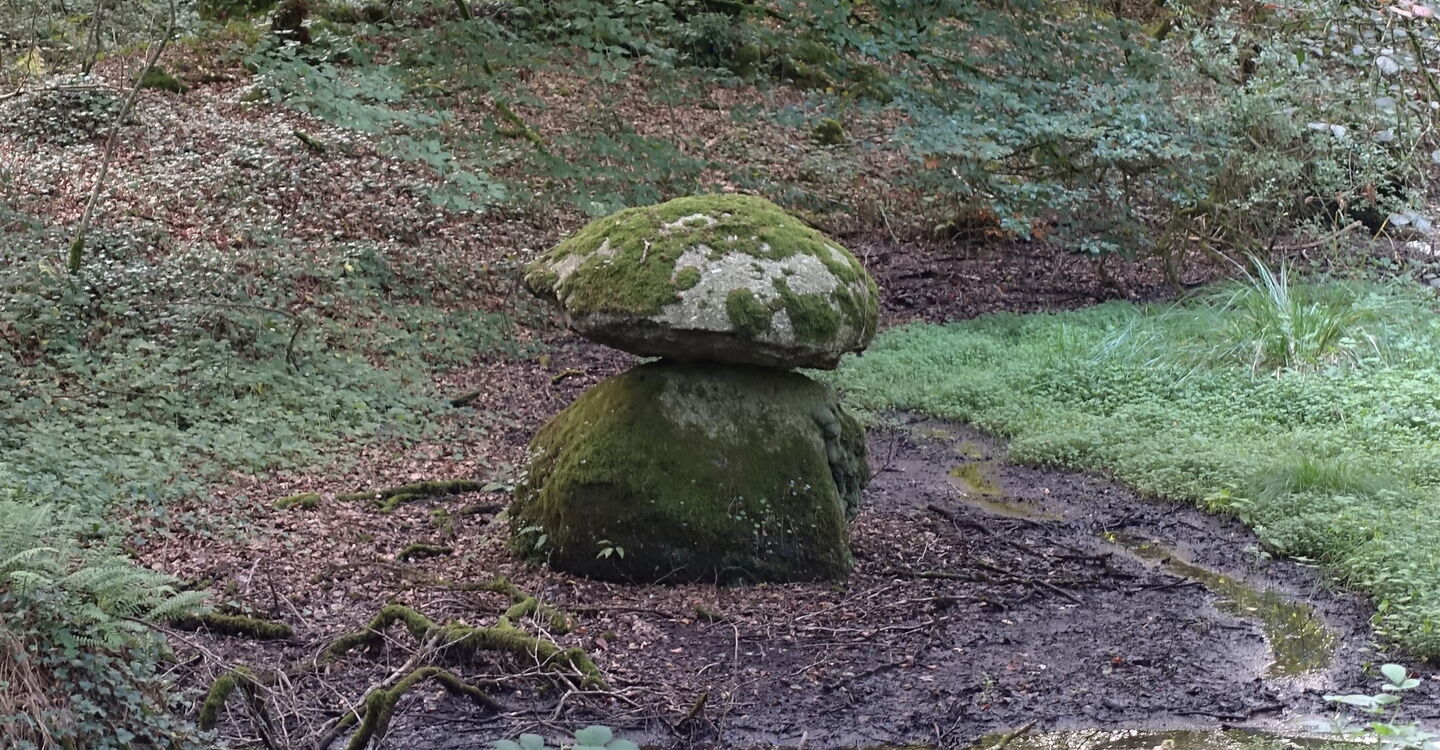 Kleine und laut plätschernde Bachläufe werden gequert. Wir ignorieren alle Abzweiger und gehen entlang des Flusses L‘ Aven bis zu einer Weggabelung. Hier gehen wir halb links, wir ignorieren zwei rechte Abzweiger und setzen unseren Weg 03 im Bois d'Amour (19 m) fort. Wer aufmerksam beobachtet, findet besonders große Steinpilze. Bei einem weiteren Wasserreservoir, das man links durch das Dickicht sehen kann, ignorieren wir den linken Abzweiger. An der nächsten Weggabelung folgen wir der Ausschilderung Richtung Village Le Haut de Bois – wir gehen also halb links.