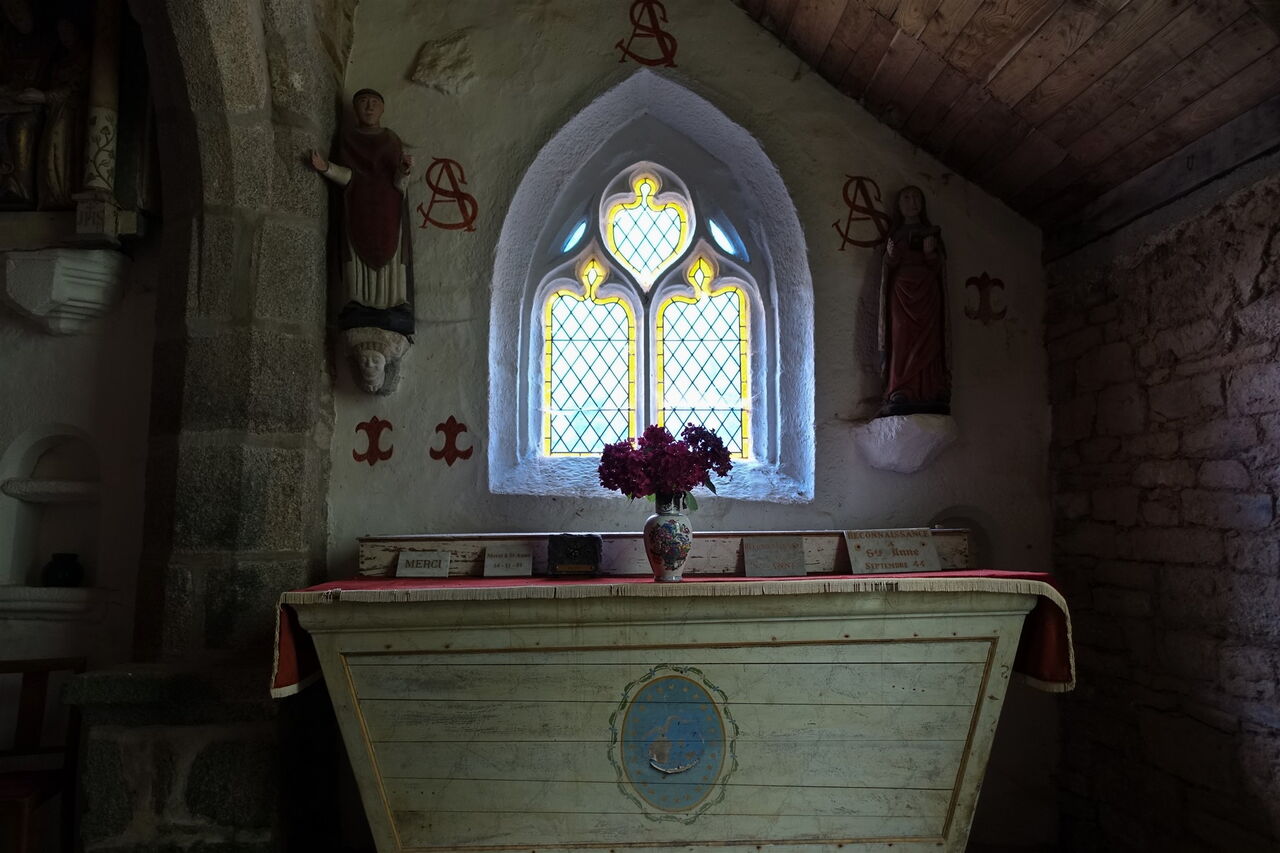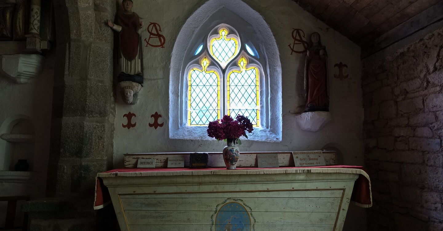 Es folgt ein wunderschöner Hohlweg. Der weitere Verlauf: Wir passieren ein Viehgatter, der Pfad mündet in einen breiteren Weg, auf dem wir weitergehen, wir laufen durch eine Linkskurve und über einen kleinen Bachlauf und an einer Lichtung halten wir uns links. Durch eine Buchenallee gehen wir nun direkt auf die 1550 erbaute 05 Chapelle de Trémalo (62 m) zu. Wir setzen unseren Weg auf der nach Osten weiterführenden Straße fort, um dann bei dem Sackgassenschild und einem auffallenden roten Wasserhydranten rechts abzubiegen. In der darauffolgenden Rechtskurve der Straße – hier befindet sich auch ein Holzgatter – gehen wir links und dann gleich vor der Lichtung rechts, um den nachfolgenden Pfad zu erreichen. Dieser mündet in eine Straße und die Brücke, unter der wir unser Auto geparkt haben.