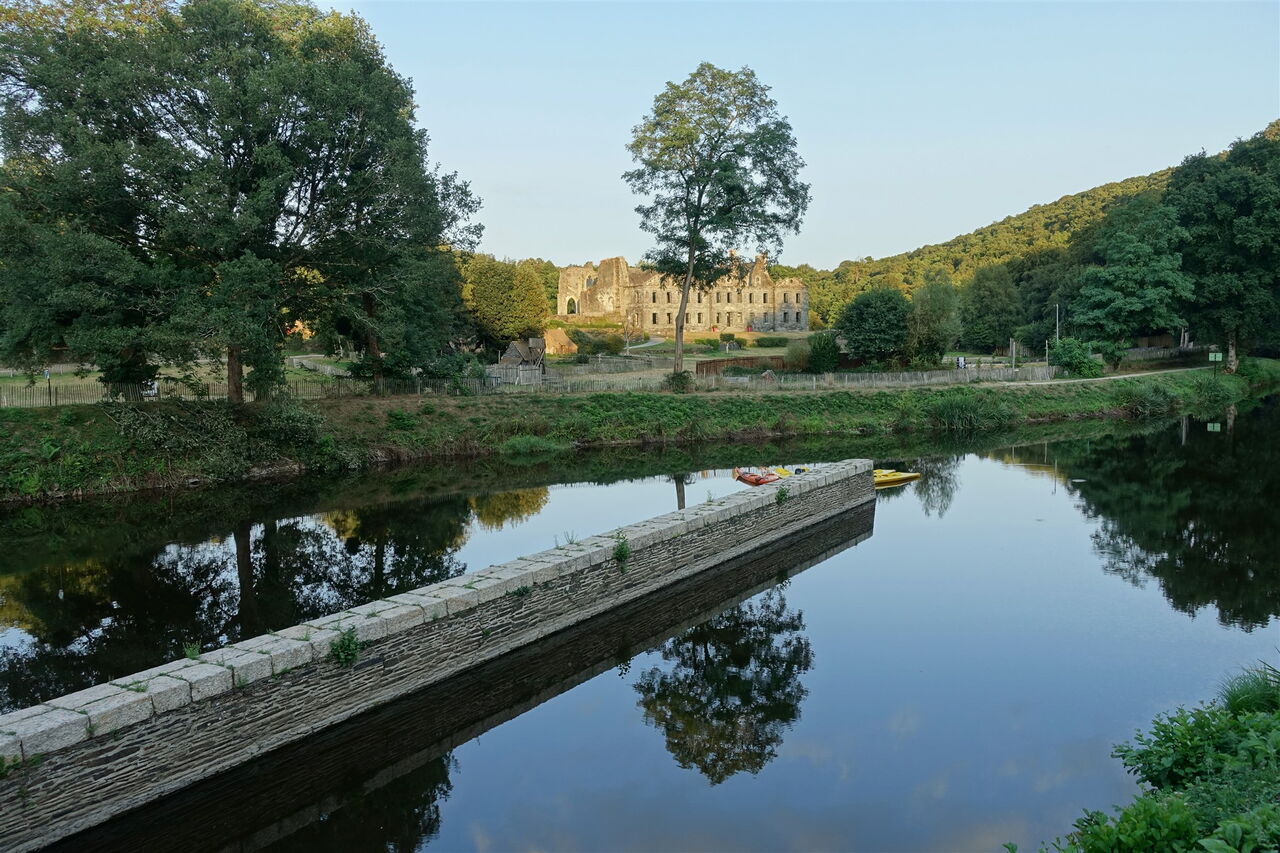 Wir gehen rechts an der Straße entlang und dort, wo von rechts ein Pfad in die Straße mündet, gehen wir links in den Wald. Der Pfad mündet kurz später in einen breiten Weg, der mit moosbedeckten Steinen gesäumt ist. Kurz später wird der Weg wieder zum Pfad und führt an einer Lichtung vorbei. Hinter einem Mauerdurchbruch gehen wir rechts weiter, entlang dieser moosbedeckten Mauer. An einigen Stellen ist die Wegführung nicht eindeutig, man kann sich aber an den Überresten der moosbedeckten Mauer orientieren. Zwischenzeitlich wird der Pfad wieder zum Weg. Bei einer Weggabelung, wo sich mittig ein Baum befindet, halten wir uns halb links. Von links mündet ein weiterer Pfad in unseren Weg, wir vernehmen Autogeräusche und erreichen die Schleuse 05 Ecluse de Bon Repos (126 m). Es ergibt sich ein malerisches Bild mit den dahinter liegenden Ruinen der Abtei, besonders in den Abendstunden.