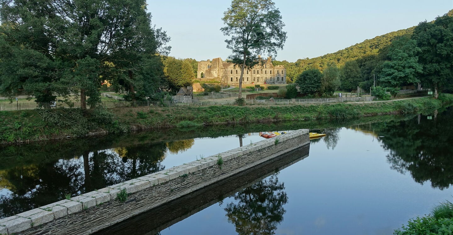 Vom Parkplatz aus gehen wir auf der Allee durch den Torbogen bis zum 1184 gegründeten Zisterzienserkloster 01 Abbaye de Bon Repos (130 m). Zisterzienser nennen sich Mönche und Nonnen, die nach der Tradition der Gründer des Klosters Cîteaux ein Leben des Gebets, der Lesung und der Arbeit führen. Der Zisterzienserorden entstand durch Reformen aus der Tradition des Ordens der Benediktiner. Während der Französischen Revolution wurde die Abtei stark beschädigt, seitdem ist sie dem Verfall preisgegeben – dennoch ein sehr interessanter und informativer Besuch, denn ehrenamtliche Handwerker geben den imposanten Überresten ihren Glanz zurück. Zur Wanderung: Wir gehen um die südliche Spitze der Klosterruinen herum, dann entlang einer hohen Steinmauer, durch eine Rechtskehre des Pfads und über eine Brücke, um so an den Kanal zu gelangen.